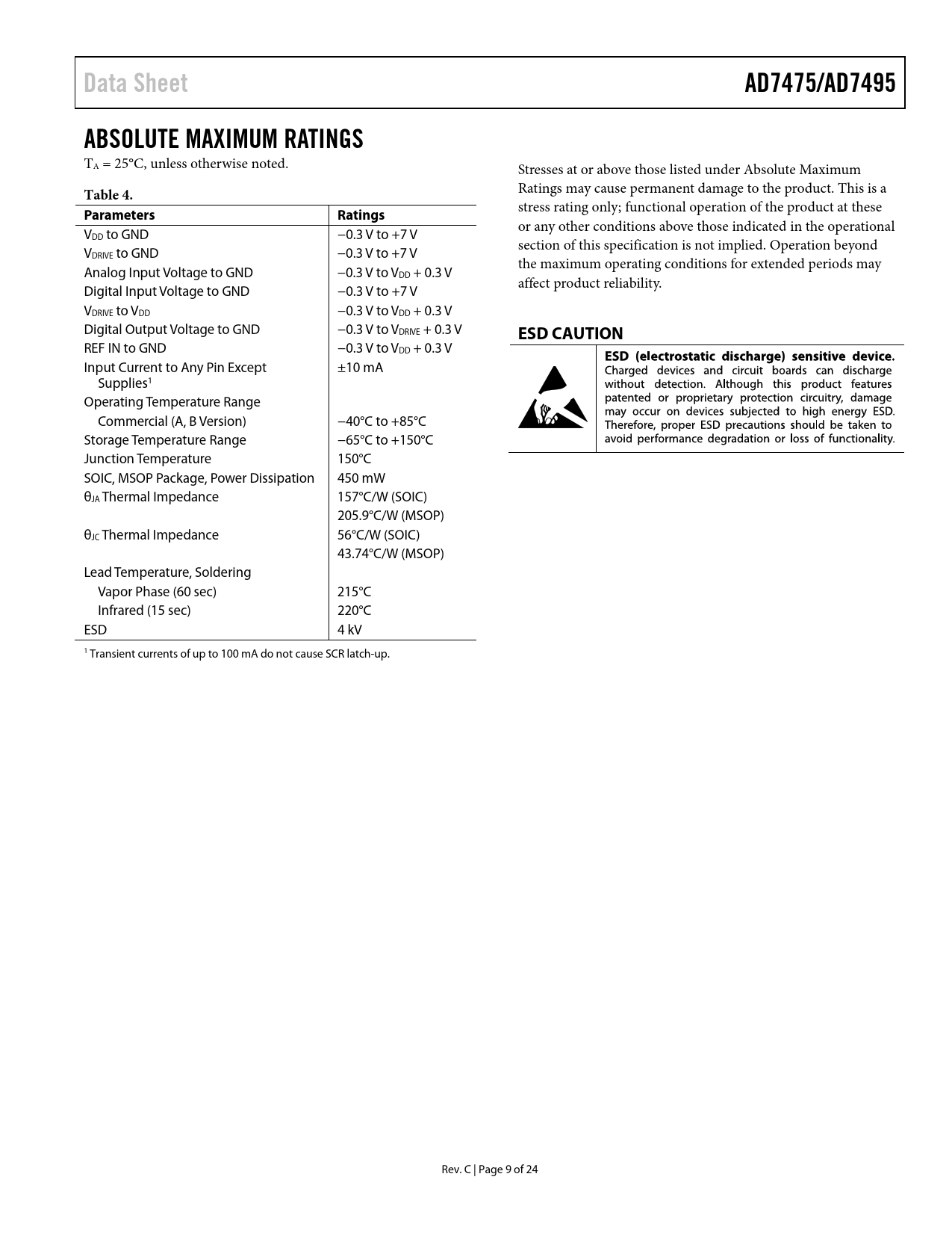 Data SheetAD7475/AD7495ABSOLUTE MAXIMUM RATINGS TA = 25°C, unless otherwise noted. Stresses at or above those listed under Absolute Maximum Table 4. Ratings may cause permanent damage to the product. This is a ParametersRatings stress rating only; functional operation of the product at these or any other conditions above those indicated in the operational VDD to GND −0.3 V to +7 V section of this specification is not implied. Operation beyond VDRIVE to GND −0.3 V to +7 V the maximum operating conditions for extended periods may Analog Input Voltage to GND −0.3 V to VDD + 0.3 V affect product reliability. Digital Input Voltage to GND −0.3 V to +7 V VDRIVE to VDD −0.3 V to VDD + 0.3 V Digital Output Voltage to GND −0.3 V to VDRIVE + 0.3 V ESD CAUTION REF IN to GND −0.3 V to VDD + 0.3 V Input Current to Any Pin Except ±10 mA Supplies1 Operating Temperature Range Commercial (A, B Version) −40°C to +85°C Storage Temperature Range −65°C to +150°C Junction Temperature 150°C SOIC, MSOP Package, Power Dissipation 450 mW θJA Thermal Impedance 157°C/W (SOIC) 205.9°C/W (MSOP) θJC Thermal Impedance 56°C/W (SOIC) 43.74°C/W (MSOP) Lead Temperature, Soldering Vapor Phase (60 sec) 215°C Infrared (15 sec) 220°C ESD 4 kV 1 Transient currents of up to 100 mA do not cause SCR latch-up. Rev. C | Page 9 of 24 Document Outline FEATURES APPLICATIONS GENERAL DESCRIPTION FUNCTIONAL BLOCK DIAGRAM PRODUCT HIGHLIGHTS REVISION HISTORY AD7475 SPECIFICATIONS AD7495 SPECIFICATIONS TIMING EXAMPLE 1 TIMING EXAMPLE 2 ABSOLUTE MAXIMUM RATINGS ESD CAUTION PIN CONFIGURATIONS AND FUNCTION DESCRIPTIONS TERMINOLOGY TYPICAL PERFORMANCE CHARACTERISTICS THEORY OF OPERATION CONVERTER OPERATION ADC TRANSFER FUNCTION TYPICAL CONNECTION DIAGRAM Analog Input Digital Inputs VDRIVE Reference Section OPERATING MODES NORMAL MODE PARTIAL POWER-DOWN MODE Power-Up Time FULL POWER-DOWN MODE POWER VS. THROUGHPUT RATE SERIAL INTERFACE MICROPROCESSOR INTERFACING AD7475/AD7495 TO TMS320C5x/C54x AD7475/AD7495 TO ADSP-21xx AD7475/AD7495 TO DSP56xxx AD7475/AD7495 TO MC68HC16 OUTLINE DIMENSIONS ORDERING GUIDE