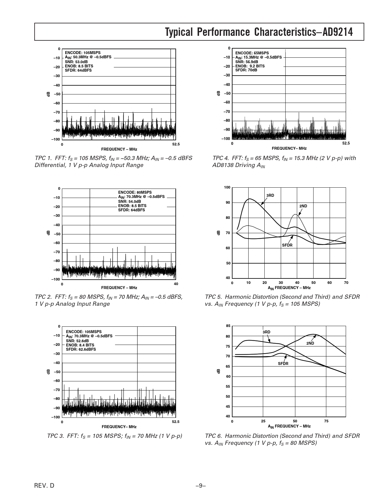 TPC 3. FFT: fS = 105 MSPS; fIN = 70 MHz (1 V p-p) TPC 6. Harmonic Distortion (Second and Third) and SFDR vs. AIN Frequency (1 V p-p, fS = 80 MSPS) REV. D –9–