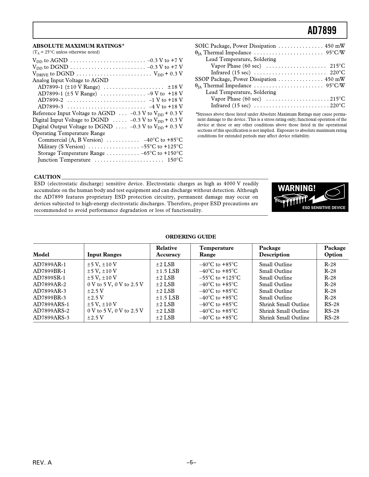 AD7899. ABSOLUTE MAXIMUM RATINGS. CAUTION. WARNING!. ESD SENSITIVE DEVICE. ORDERING GUIDE. Relative. Temperature. Package. Model