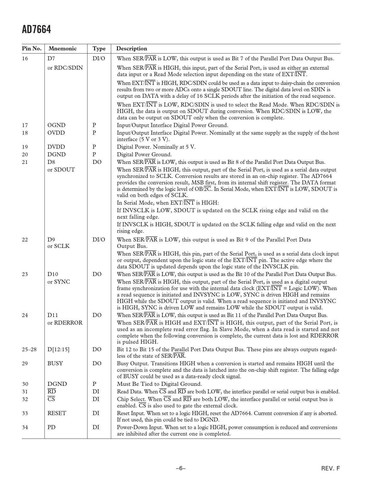 16 D7 DI/O When SER/PAR is LOW, this output is used as Bit 7 of the Parallel Port Data Output Bus. or RDC/SDIN When SER/PAR is HIGH, this input, part of the Serial Port, is used as either an external data input or a Read Mode selection input depending on the state of EXT/INT. When EXT/INT is HIGH, RDC/SDIN could be used as a data input to daisy-chain the conversion results from two or more ADCs onto a single SDOUT line. The digital data level on SDIN is output on DATA with a delay of 16 SCLK periods after the initiation of the read sequence. When EXT/INT is LOW, RDC/SDIN is used to select the Read Mode. When RDC/SDIN is HIGH, the data is output on SDOUT during conversion. When RDC/SDIN is LOW, the data can be output on SDOUT only when the conversion is complete. 17 OGND P Input/Output Interface Digital Power Ground. 18 OVDD P Input/Output Interface Digital Power. Nominally at the same supply as the supply of the host interface (5 V or 3 V). 19 DVDD P Digital Power. Nominally at 5 V. 20 DGND P Digital Power Ground. 21 D8 DO When SER/PAR is LOW, this output is used as Bit 8 of the Parallel Port Data Output Bus. or SDOUT When SER/PAR is HIGH, this output, part of the Serial Port, is used as a serial data output synchronized to SCLK. Conversion results are stored in an on-chip register. The AD7664 provides the conversion result, MSB first, from its internal shift register. The DATA format is determined by the logic level of OB/2C. In Serial Mode, when EXT/INT is LOW, SDOUT is valid on both edges of SCLK. In Serial Mode, when EXT/INT is HIGH: If INVSCLK is LOW, SDOUT is updated on the SCLK rising edge and valid on the next falling edge. If INVSCLK is HIGH, SDOUT is updated on the SCLK falling edge and valid on the next rising edge. 22 D9 DI/O When SER/PAR is LOW, this output is used as Bit 9 of the Parallel Port Data or SCLK Output Bus. When SER/PAR is HIGH, this pin, part of the Serial Port, is used as a serial data clock input or output, dependent upon the logic state of the EXT/INT pin. The active edge where the data SDOUT is updated depends upon the logic state of the INVSCLK pin. 23 D10 DO When SER/PAR is LOW, this output is used as the Bit 10 of the Parallel Port Data Output Bus. or SYNC When SER/PAR is HIGH, this output, part of the Serial Port, is used as a digital output frame synchronization for use with the internal data clock (EXT/INT = Logic LOW). When a read sequence is initiated and INVSYNC is LOW, SYNC is driven HIGH and remains HIGH while the SDOUT output is valid. When a read sequence is initiated and INVSYNC is HIGH, SYNC is driven LOW and remains LOW while the SDOUT output is valid. 24 D11 DO When SER/PAR is LOW, this output is used as Bit 11 of the Parallel Port Data Output Bus. or RDERROR When SER/PAR is HIGH and EXT/INT is HIGH, this output, part of the Serial Port, is used as an incomplete read error flag. In Slave Mode, when a data read is started and not complete when the following conversion is complete, the current data is lost and RDERROR is pulsed HIGH. 25–28 D[12:15] DO Bit 12 to Bit 15 of the Parallel Port Data Output Bus. These pins are always outputs regard- less of the state of SER/PAR. 29 BUSY DO Busy Output. Transitions HIGH when a conversion is started and remains HIGH until the conversion is complete and the data is latched into the on-chip shift register. The falling edge of BUSY could be used as a data-ready clock signal. 30 DGND P Must Be Tied to Digital Ground. 31 RD DI Read Data. When CS and RD are both LOW, the interface parallel or serial output bus is enabled. 32 CS DI Chip Select. When CS and RD are both LOW, the interface parallel or serial output bus is enabled. CS is also used to gate the external clock. 33 RESET DI Reset Input. When set to a logic HIGH, reset the AD7664. Current conversion if any is aborted. If not used, this pin could be tied to DGND. 34 PD DI Power-Down Input. When set to a logic HIGH, power consumption is reduced and conversions are inhibited after the current one is completed. –6– REV. F Document Outline FEATURES APPLICATIONS FUNCTIONAL BLOCK DIAGRAM GENERAL DESCRIPTION PRODUCT HIGHLIGHTS SPECIFICATIONS TIMING SPECIFICATIONS ABSOLUTE MAXIMUM RATINGS ORDERING GUIDE PIN CONFIGURATION PIN FUNCTION DESCRIPTIONS DEFINITION OF SPECIFICATIONS Integral Nonlinearity Error (INL) Differential Nonlinearity Error (DNL) Full-Scale Error Unipolar Zero Error Spurious-Free Dynamic Range (SFDR) Effective Number of Bits (ENOB) Total Harmonic Distortion (THD) Signal-to-Noise Ratio (SNR) Signal to (Noise + Distortion) Ratio (S/[N+D]) Aperture Delay Transient Response Overvoltage Recovery Typical Performance Characteristics CIRCUIT INFORMATION CONVERTER OPERATION Modes of Operation Transfer Functions TYPICAL CONNECTION DIAGRAM Analog Input Driver Amplifier Choice Voltage Reference Input Power Supply POWER DISSIPATION VERSUS THROUGHPUT CONVERSION CONTROL DIGITAL INTERFACE PARALLEL INTERFACE SERIAL INTERFACE MASTER SERIAL INTERFACE Internal Clock SLAVE SERIAL INTERFACE External Clock External Discontinuous Clock Data Read after Conversion External Clock Data Read during Conversion MICROPROCESSOR INTERFACING SPI Interface (ADSP-219x) APPLICATION HINTS Bipolar and Wider Input Ranges Layout OUTLINE DIMENSIONS Revision History