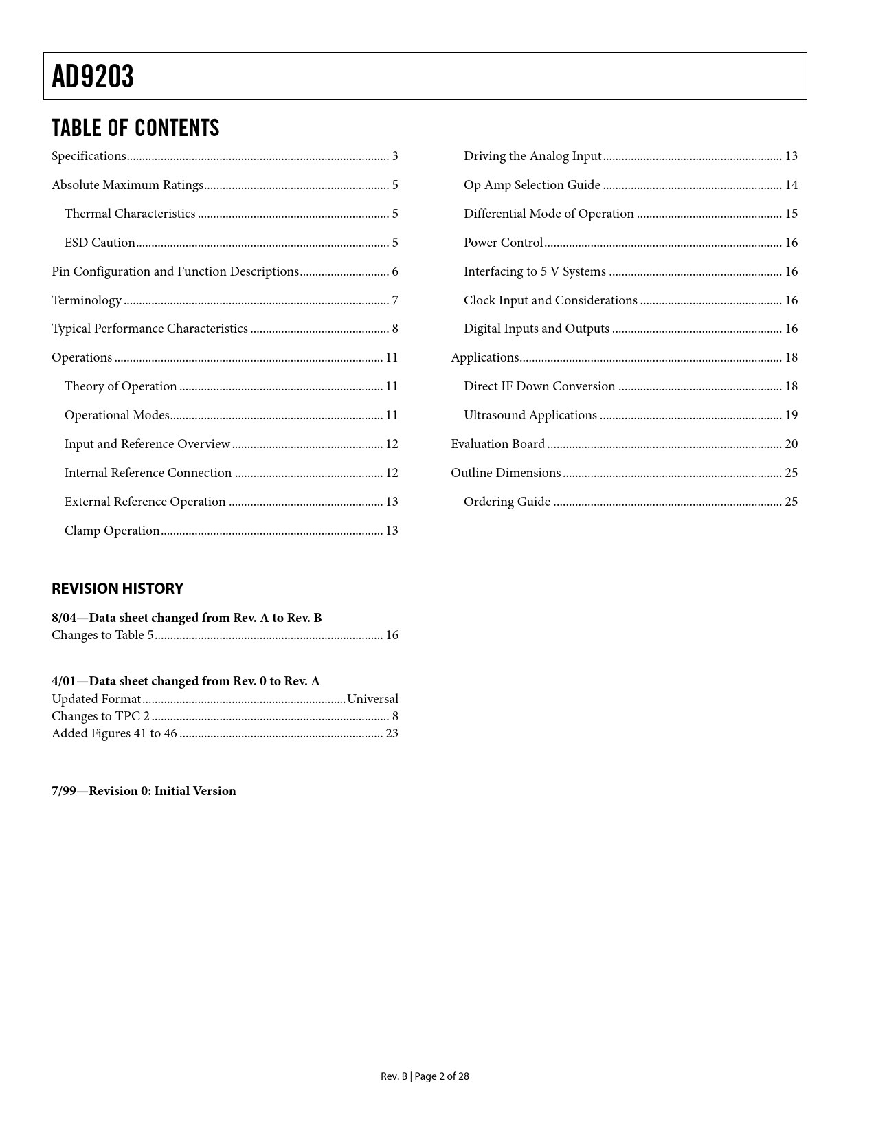 AD9203 TABLE OF CONTENTS REVISION HISTORY 8/04—Data sheet changed from Rev A to Rev B