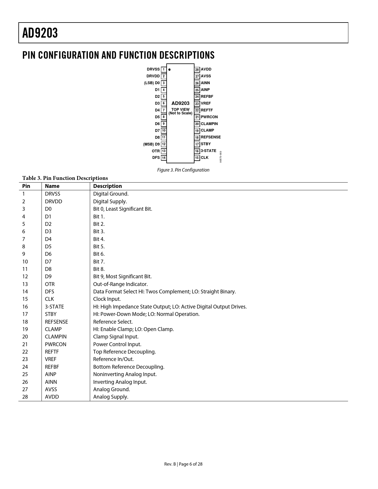 AD9203. PIN CONFIGURATION AND FUNCTION DESCRIPTIONS. DRVSS 1. 28 AVDD. DRVDD 2. 27 AVSS. (LSB) D0 3. 26 AINN. D1 4. 25 AINP. D2 5. 24 REFBF