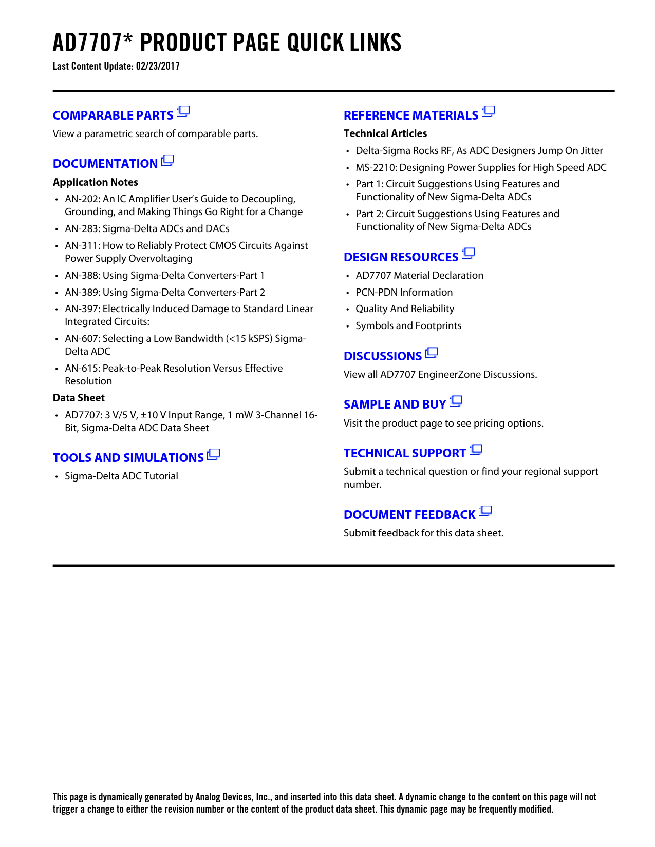 AD7707* PRODUCT PAGE QUICK LINKS Last Content Update: 02/23/2017 COMPARABLE PARTS REFERENCE MATERIALS