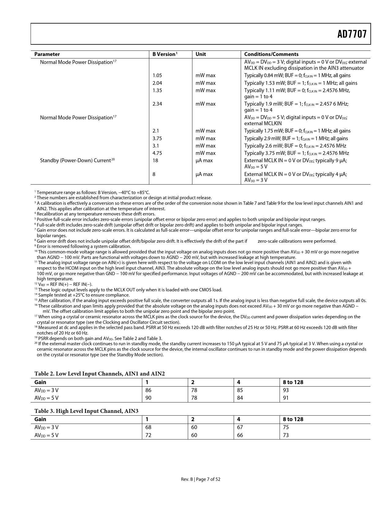 AD7707 Parameter B Version1 Unit Conditions/Comments Table 2 Low Level Input Channels, AIN1 and AIN2 Gain 8 to 128