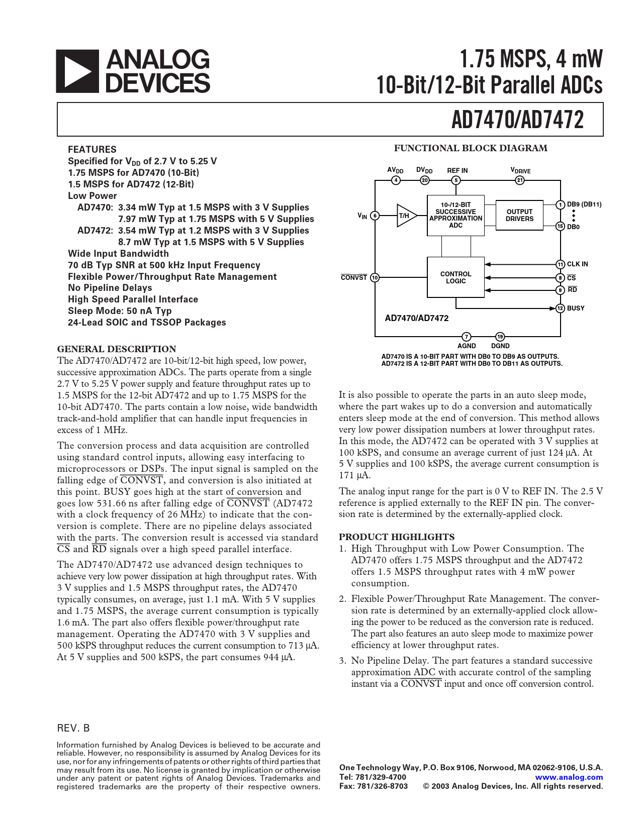 CS and RD signals over a high speed parallel interface. 1. High Throughput with Low Power Consumption. The AD7470 offers 1.75 MSPS throughput and the AD7472 The AD7470/AD7472 use advanced design techniques to offers 1.5 MSPS throughput rates with 4 mW power achieve very low power dissipation at high throughput rates. With consumption. 3 V supplies and 1.5 MSPS throughput rates, the AD7470 typically consumes, on average, just 1.1 mA. With 5 V supplies 2. Flexible Power/Throughput Rate Management. The conver- and 1.75 MSPS, the average current consumption is typically sion rate is determined by an externally-applied clock allow- 1.6 mA. The part also offers flexible power/throughput rate ing the power to be reduced as the conversion rate is reduced. management. Operating the AD7470 with 3 V supplies and The part also features an auto sleep mode to maximize power 500 kSPS throughput reduces the current consumption to 713 µA. efficiency at lower throughput rates. At 5 V supplies and 500 kSPS, the part consumes 944 µA. 3. No Pipeline Delay. The part features a standard successive approximation ADC with accurate control of the sampling instant via a CONVST input and once off conversion control. REV. B Information furnished by Analog Devices is believed to be accurate and reliable. However, no responsibility is assumed by Analog Devices for its use, nor for any infringements of patents or other rights of third parties that may result from its use. No license is granted by implication or otherwise