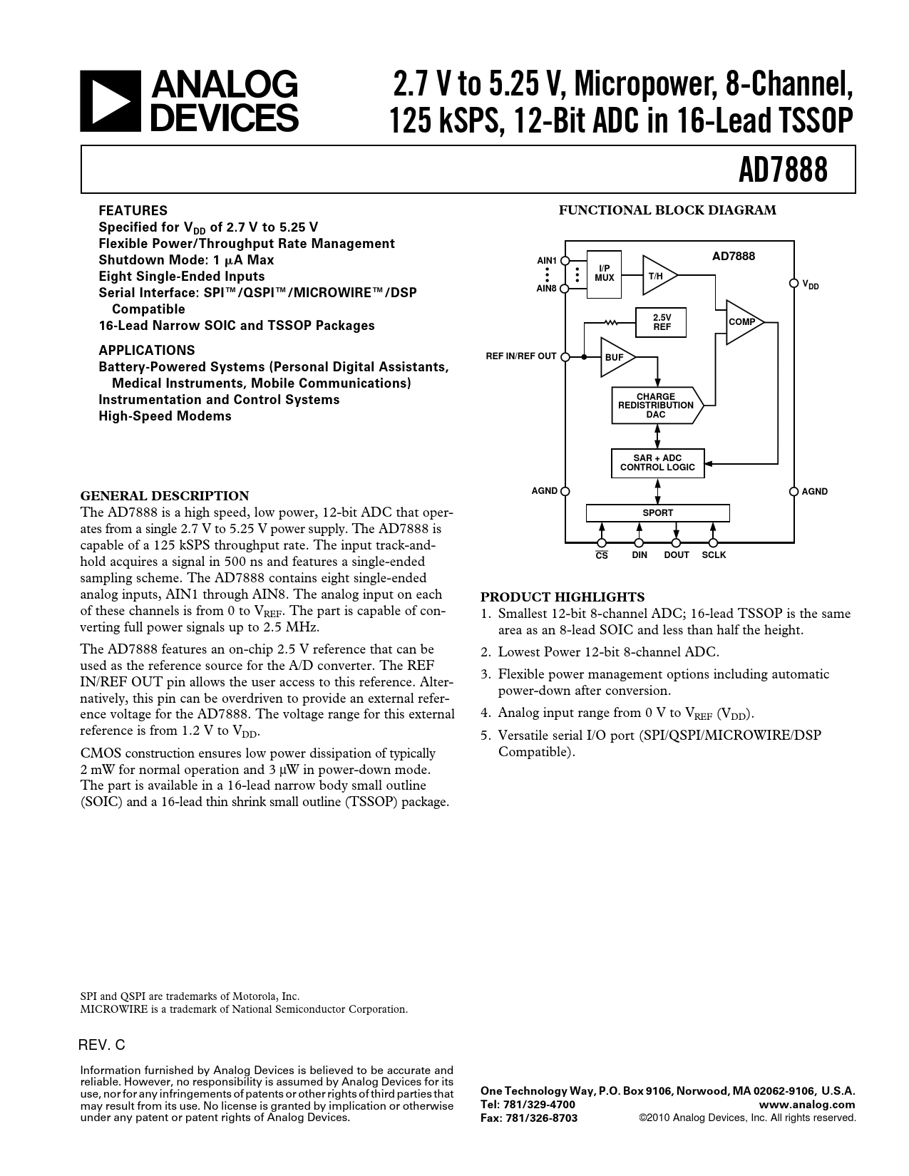 2.7 V to 5.25 V, Micropower, 8-Channel,. 125 kSPS, 12-Bit ADC in 16-Lead TSSOP. AD7888. FEATURES. FUNCTIONAL BLOCK DIAGRAM