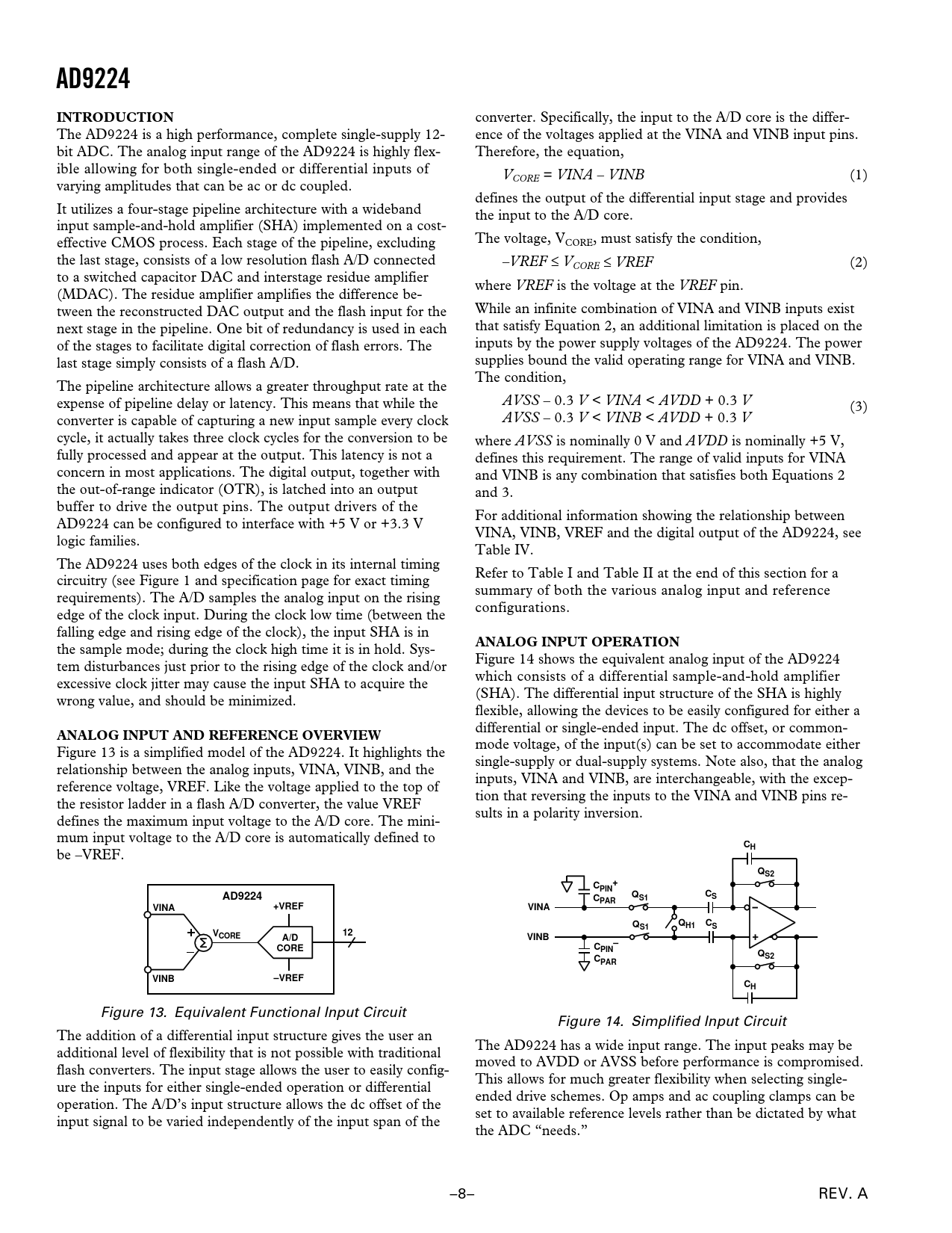 inputs, VINA and VINB, are interchangeable, with the exception that reversing the inputs to the VINA and VINB pins results in a polarity inversion. ANALOG INPUT AND REFERENCE OVERVIEW Figure 13 is a simplified model of the AD9224. It highlights the