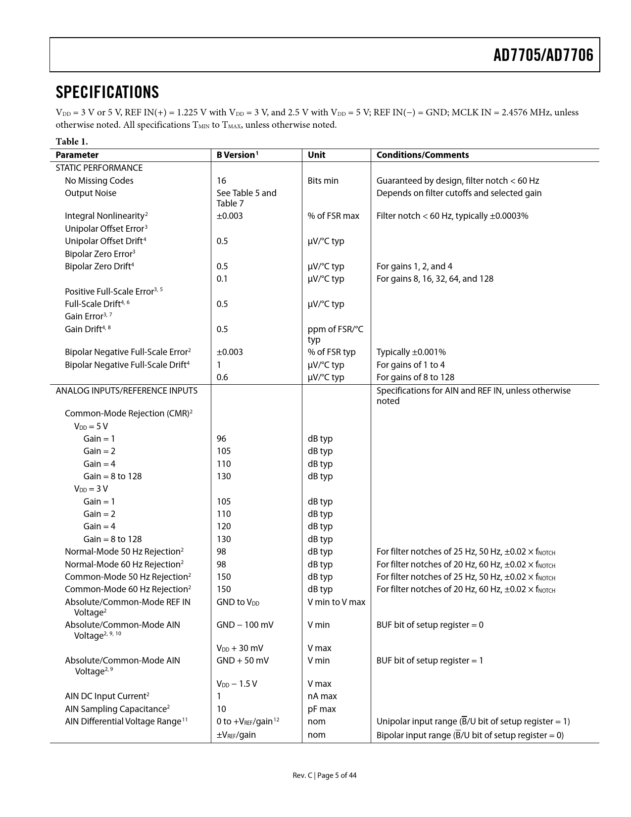 Seiten / Seite44 / 5 — AD7705/AD7706. SPECIFICATIONS. Table 1. Parameter B. Version1 Unit. …