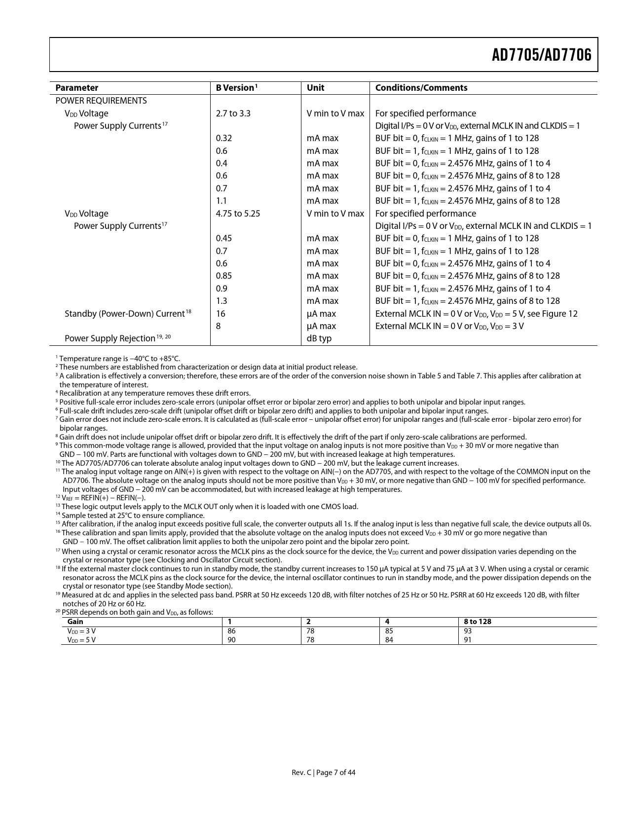 POWER REQUIREMENTS VDD Voltage 2.7 to 3.3 V min to V max For specified performance Power Supply Currents17 Digital I/Ps = 0 V or VDD, external MCLK IN and CLKDIS = 1 0.32 mA max BUF bit = 0, fCLKIN = 1 MHz, gains of 1 to 128 0.6 mA max BUF bit = 1, fCLKIN = 1 MHz, gains of 1 to 128 0.4 mA max BUF bit = 0, fCLKIN = 2.4576 MHz, gains of 1 to 4 0.6 mA max BUF bit = 0, fCLKIN = 2.4576 MHz, gains of 8 to 128 0.7 mA max BUF bit = 1, fCLKIN = 2.4576 MHz, gains of 1 to 4 1.1 mA max BUF bit = 1, fCLKIN = 2.4576 MHz, gains of 8 to 128 VDD Voltage 4.75 to 5.25 V min to V max For specified performance Power Supply Currents17 Digital I/Ps = 0 V or VDD, external MCLK IN and CLKDIS = 1 0.45 mA max BUF bit = 0, fCLKIN = 1 MHz, gains of 1 to 128 0.7 mA max BUF bit = 1, fCLKIN = 1 MHz, gains of 1 to 128 0.6 mA max BUF bit = 0, fCLKIN = 2.4576 MHz, gains of 1 to 4 0.85 mA max BUF bit = 0, fCLKIN = 2.4576 MHz, gains of 8 to 128 0.9 mA max BUF bit = 1, fCLKIN = 2.4576 MHz, gains of 1 to 4 1.3 mA max BUF bit = 1, fCLKIN = 2.4576 MHz, gains of 8 to 128 Standby (Power-Down) Current18 16 μA max External MCLK IN = 0 V or VDD, VDD = 5 V, see Figure 12 8 μA max External MCLK IN = 0 V or VDD, VDD = 3 V Power Supply Rejection19, 20 dB typ 1 Temperature range is −40°C to +85°C. 2 These numbers are established from characterization or design data at initial product release. 3 A calibration is effectively a conversion; therefore, these errors are of the order of the conversion noise shown in Table 5 and Table 7. This applies after calibration at the temperature of interest. 4 Recalibration at any temperature removes these drift errors. 5 Positive full-scale error includes zero-scale errors (unipolar offset error or bipolar zero error) and applies to both unipolar and bipolar input ranges. 6 Full-scale drift includes zero-scale drift (unipolar offset drift or bipolar zero drift) and applies to both unipolar and bipolar input ranges. 7 Gain error does not include zero-scale errors. It is calculated as (full-scale error – unipolar offset error) for unipolar ranges and (full-scale error - bipolar zero error) for bipolar ranges. 8 Gain drift does not include unipolar offset drift or bipolar zero drift. It is effectively the drift of the part if only zero-scale calibrations are performed. 9 This common-mode voltage range is allowed, provided that the input voltage on analog inputs is not more positive than VDD + 30 mV or more negative than GND − 100 mV. Parts are functional with voltages down to GND − 200 mV, but with increased leakage at high temperatures. 10 The AD7705/AD7706 can tolerate absolute analog input voltages down to GND − 200 mV, but the leakage current increases. 11 The analog input voltage range on AIN(+) is given with respect to the voltage on AIN(−) on the AD7705, and with respect to the voltage of the COMMON input on the AD7706. The absolute voltage on the analog inputs should not be more positive than VDD + 30 mV, or more negative than GND − 100 mV for specified performance. Input voltages of GND − 200 mV can be accommodated, but with increased leakage at high temperatures. 12 VREF = REFIN(+) − REFIN(−). 13 These logic output levels apply to the MCLK OUT only when it is loaded with one CMOS load. 14 Sample tested at 25°C to ensure compliance. 15 After calibration, if the analog input exceeds positive full scale, the converter outputs all 1s. If the analog input is less than negative full scale, the device outputs all 0s. 16 These calibration and span limits apply, provided that the absolute voltage on the analog inputs does not exceed VDD + 30 mV or go more negative than GND − 100 mV. The offset calibration limit applies to both the unipolar zero point and the bipolar zero point. 17 When using a crystal or ceramic resonator across the MCLK pins as the clock source for the device, the VDD current and power dissipation varies depending on the crystal or resonator type (see Clocking and Oscillator Circuit section). 18 If the external master clock continues to run in standby mode, the standby current increases to 150 μA typical at 5 V and 75 μA at 3 V. When using a crystal or ceramic resonator across the MCLK pins as the clock source for the device, the internal oscillator continues to run in standby mode, and the power dissipation depends on the crystal or resonator type (see Standby Mode section). 19 Measured at dc and applies in the selected pass band. PSRR at 50 Hz exceeds 120 dB, with filter notches of 25 Hz or 50 Hz. PSRR at 60 Hz exceeds 120 dB, with filter notches of 20 Hz or 60 Hz. 20 PSRR depends on both gain and VDD, as follows: