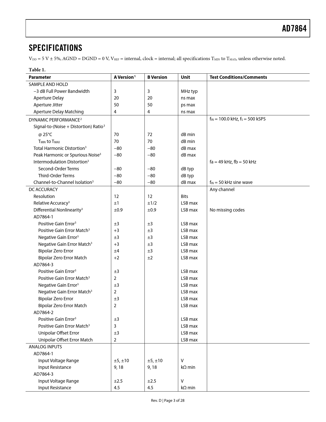 AD7864. SPECIFICATIONS. Table 1. Parameter A. Version1. B Version. Unit. Test Conditions/Comments