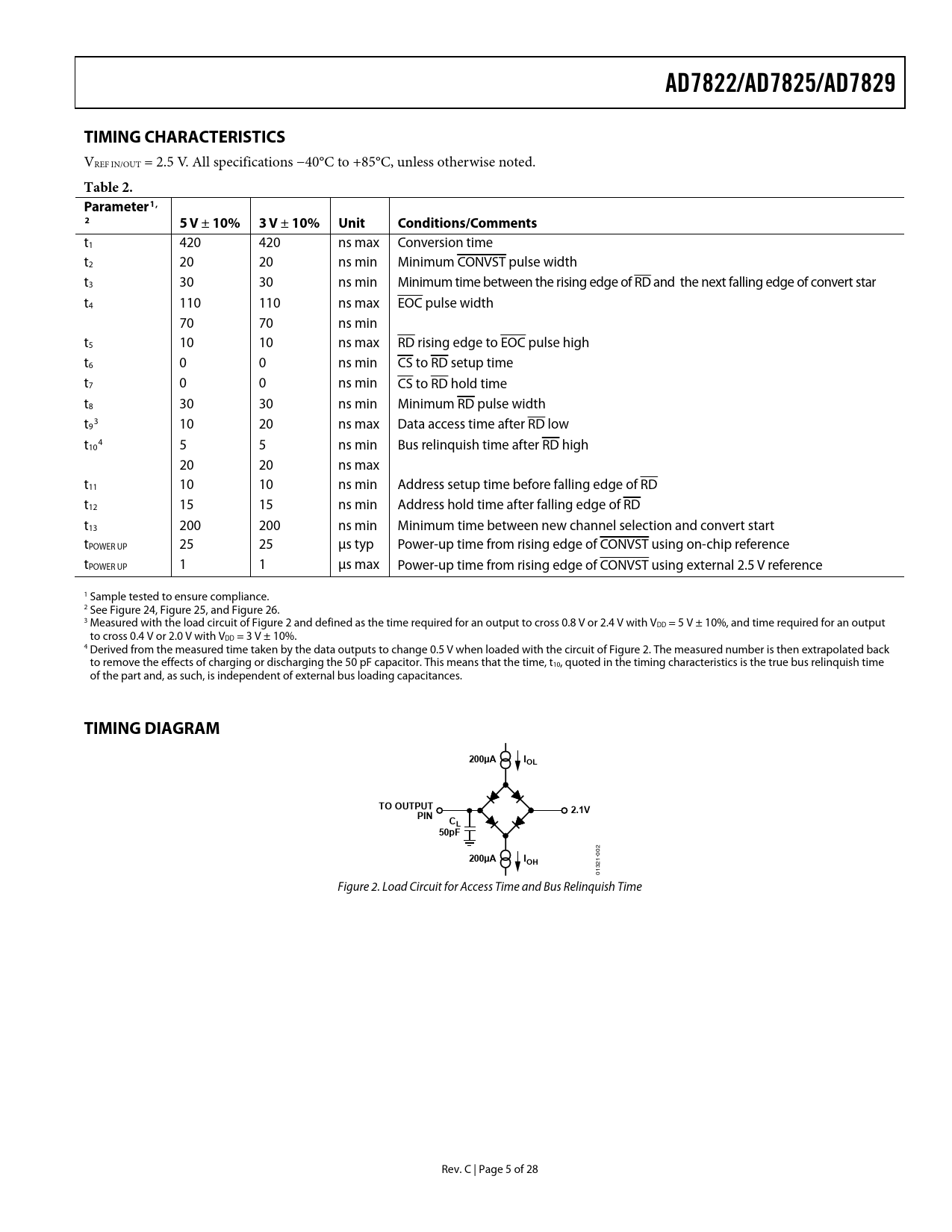 AD7822/AD7825/AD7829 TIMING CHARACTERISTICS Table 2 Parameter1 5 V 10% 3 V Unit Conditions/Comments TIMING DIAGRAM 200µA IOL