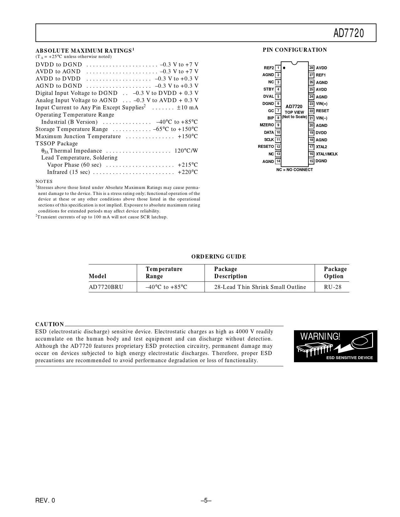 AD7720ABSOLUTE MAXIMUM RATINGS1PIN CONFIGURATION (TA = +25°C unless otherwise noted) DVDD to DGND . –0.3 V to +7 V REF2 128 AVDD AVDD to AGND . –0.3 V to +7 V AGND 227 REF1 AVDD to DVDD . –0.3 V to +0.3 V NC 326 AGND AGND to DGND . –0.3 V to +0.3 V STBY 425 AVDD Digital Input Voltage to DGND . –0.3 V to DVDD + 0.3 V DVAL 524 AGND Analog Input Voltage to AGND . –0.3 V to AVDD + 0.3 V DGND 623 VIN(+) Input Current to Any Pin Except Supplies2 . ± 10 mA AD7720GC 722 RESET Operating Temperature Range TOP VIEW(Not to Scale)BIP 821 VIN(–) Industrial (B Version) . –40°C to +85°C MZERO 920 AGND Storage Temperature Range . –65°C to +150°C DATA 1019 DVDD Maximum Junction Temperature . +150°C SCLK 1118 AGND TSSOP Package θ RESETO 1217 XTAL2 JA Thermal Impedance . 120°C/W NC 1316 XTAL1/MCLK Lead Temperature, Soldering AGND 1415 DGND Vapor Phase (60 sec) . +215°C Infrared (15 sec) . +220°C NC = NO CONNECT NOTES 1Stresses above those listed under Absolute Maximum Ratings may cause perma- nent damage to the device. This is a stress rating only; functional operation of the device at these or any other conditions above those listed in the operational sections of this specification is not implied. Exposure to absolute maximum rating conditions for extended periods may affect device reliability. 2Transient currents of up to 100 mA will not cause SCR latchup. ORDERING GUIDETemperaturePackagePackageModelRangeDescriptionOption AD7720BRU –40°C to +85°C 28-Lead Thin Shrink Small Outline RU-28 CAUTION ESD (electrostatic discharge) sensitive device. Electrostatic charges as high as 4000 V readily accumulate on the human body and test equipment and can discharge without detection. WARNING! Although the AD7720 features proprietary ESD protection circuitry, permanent damage may occur on devices subjected to high energy electrostatic discharges. Therefore, proper ESD ESD SENSITIVE DEVICE precautions are recommended to avoid performance degradation or loss of functionality. REV. 0 –5–