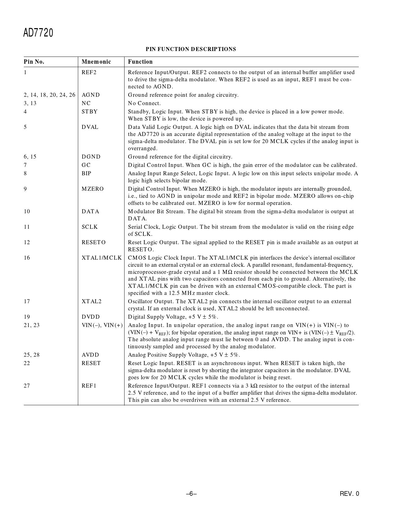 AD7720PIN FUNCTION DESCRIPTIONSPin No.MnemonicFunction 1 REF2 Reference Input/Output. REF2 connects to the output of an internal buffer amplifier used to drive the sigma-delta modulator. When REF2 is used as an input, REF1 must be con- nected to AGND. 2, 14, 18, 20, 24, 26 AGND Ground reference point for analog circuitry. 3, 13 NC No Connect. 4 STBY Standby, Logic Input. When STBY is high, the device is placed in a low power mode. When STBY is low, the device is powered up. 5 DVAL Data Valid Logic Output. A logic high on DVAL indicates that the data bit stream from the AD7720 is an accurate digital representation of the analog voltage at the input to the sigma-delta modulator. The DVAL pin is set low for 20 MCLK cycles if the analog input is overranged. 6, 15 DGND Ground reference for the digital circuitry. 7 GC Digital Control Input. When GC is high, the gain error of the modulator can be calibrated. 8 BIP Analog Input Range Select, Logic Input. A logic low on this input selects unipolar mode. A logic high selects bipolar mode. 9 MZERO Digital Control Input. When MZERO is high, the modulator inputs are internally grounded, i.e., tied to AGND in unipolar mode and REF2 in bipolar mode. MZERO allows on-chip offsets to be calibrated out. MZERO is low for normal operation. 10 DATA Modulator Bit Stream. The digital bit stream from the sigma-delta modulator is output at DATA. 11 SCLK Serial Clock, Logic Output. The bit stream from the modulator is valid on the rising edge of SCLK. 12 RESETO Reset Logic Output. The signal applied to the RESET pin is made available as an output at RESETO. 16 XTAL1/MCLK CMOS Logic Clock Input. The XTAL1/MCLK pin interfaces the device’s internal oscillator circuit to an external crystal or an external clock. A parallel resonant, fundamental-frequency, microprocessor-grade crystal and a 1 MΩ resistor should be connected between the MCLK and XTAL pins with two capacitors connected from each pin to ground. Alternatively, the XTAL1/MCLK pin can be driven with an external CMOS-compatible clock. The part is specified with a 12.5 MHz master clock. 17 XTAL2 Oscillator Output. The XTAL2 pin connects the internal oscillator output to an external crystal. If an external clock is used, XTAL2 should be left unconnected. 19 DVDD Digital Supply Voltage, +5 V ± 5%. 21, 23 VIN(–), VIN(+) Analog Input. In unipolar operation, the analog input range on VIN(+) is VIN(–) to (VIN(–) + VREF); for bipolar operation, the analog input range on VIN+ is (VIN(–) ± VREF/2). The absolute analog input range must lie between 0 and AVDD. The analog input is con- tinuously sampled and processed by the analog modulator. 25, 28 AVDD Analog Positive Supply Voltage, +5 V ± 5%. 22 RESET Reset Logic Input. RESET is an asynchronous input. When RESET is taken high, the sigma-delta modulator is reset by shorting the integrator capacitors in the modulator. DVAL goes low for 20 MCLK cycles while the modulator is being reset. 27 REF1 Reference Input/Output. REF1 connects via a 3 kΩ resistor to the output of the internal 2.5 V reference, and to the input of a buffer amplifier that drives the sigma-delta modulator. This pin can also be overdriven with an external 2.5 V reference. –6– REV. 0