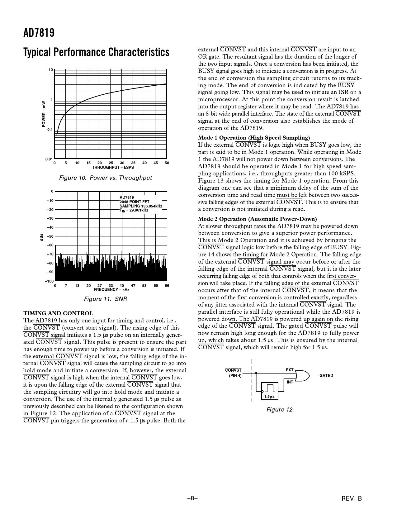 AD7819 should be operated in Mode 1 for high speed sam- pling applications, i.e., throughputs greater than 100 kSPS. Figure 10. Power vs. Throughput Figure 13 shows the timing for Mode 1 operation. From this diagram one can see that a minimum delay of the sum of the