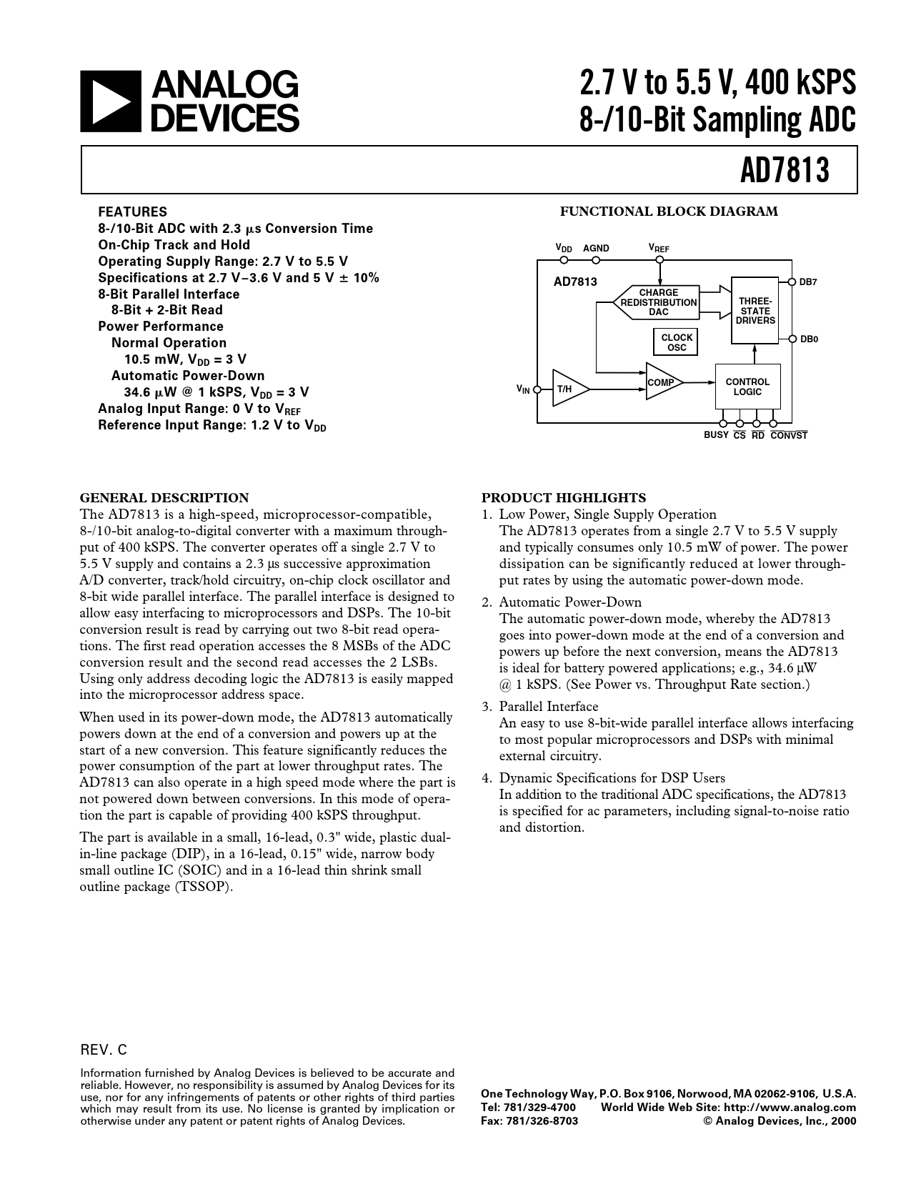 2.7 V to 5.5 V, 400 kSPS. 8-/10-Bit Sampling ADC. AD7813. FEATURES. FUNCTIONAL BLOCK DIAGRAM. 8-/10-Bit ADC with 2.3