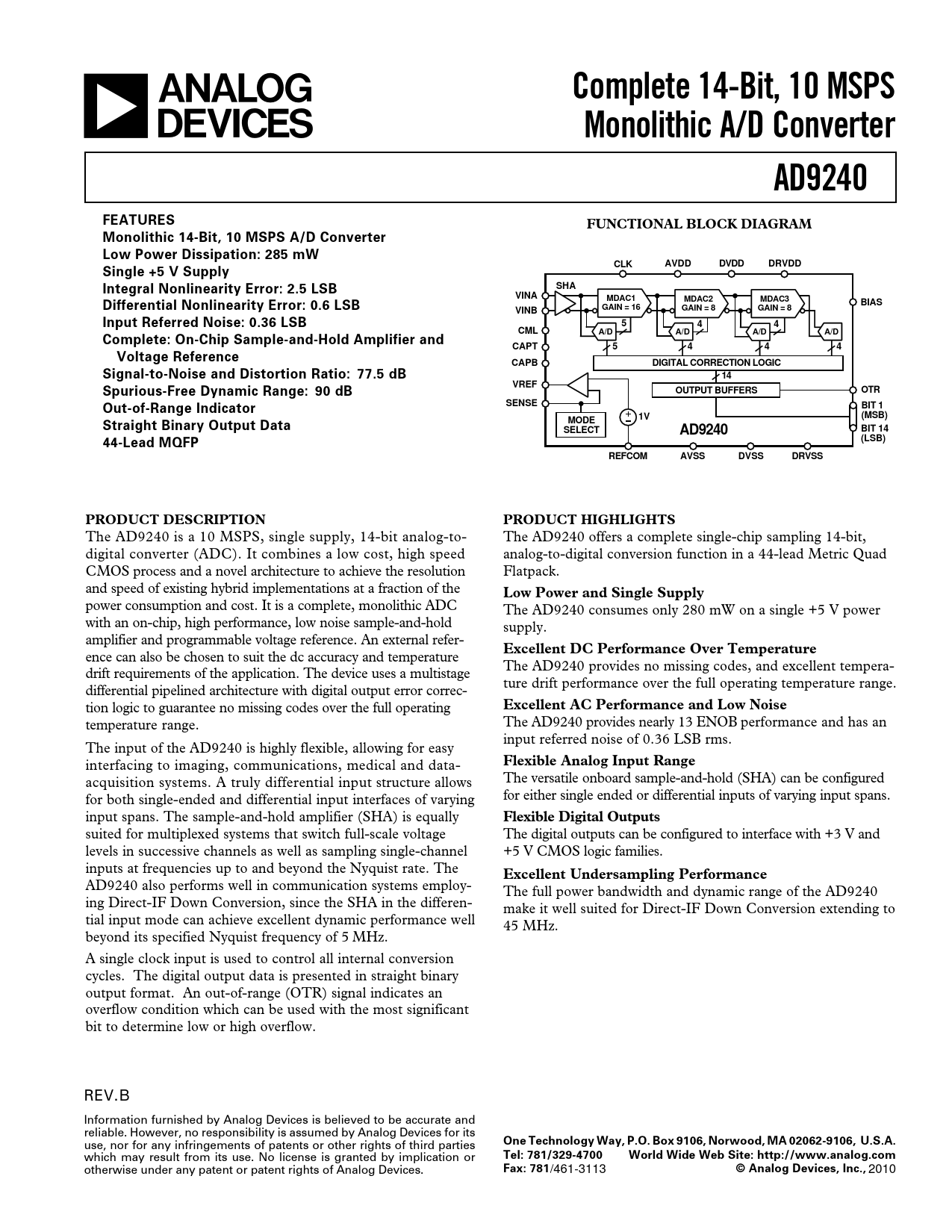 The AD9240 is a 10 MSPS, single supply, 14-bit analog-to- The AD9240 offers a complete single-chip sampling 14-bit, digital converter (ADC). It combines a low cost, high speed analog-to-digital conversion function in a 44-lead Metric Quad CMOS process and a novel architecture to achieve the resolution Flatpack. and speed of existing hybrid implementations at a fraction of the