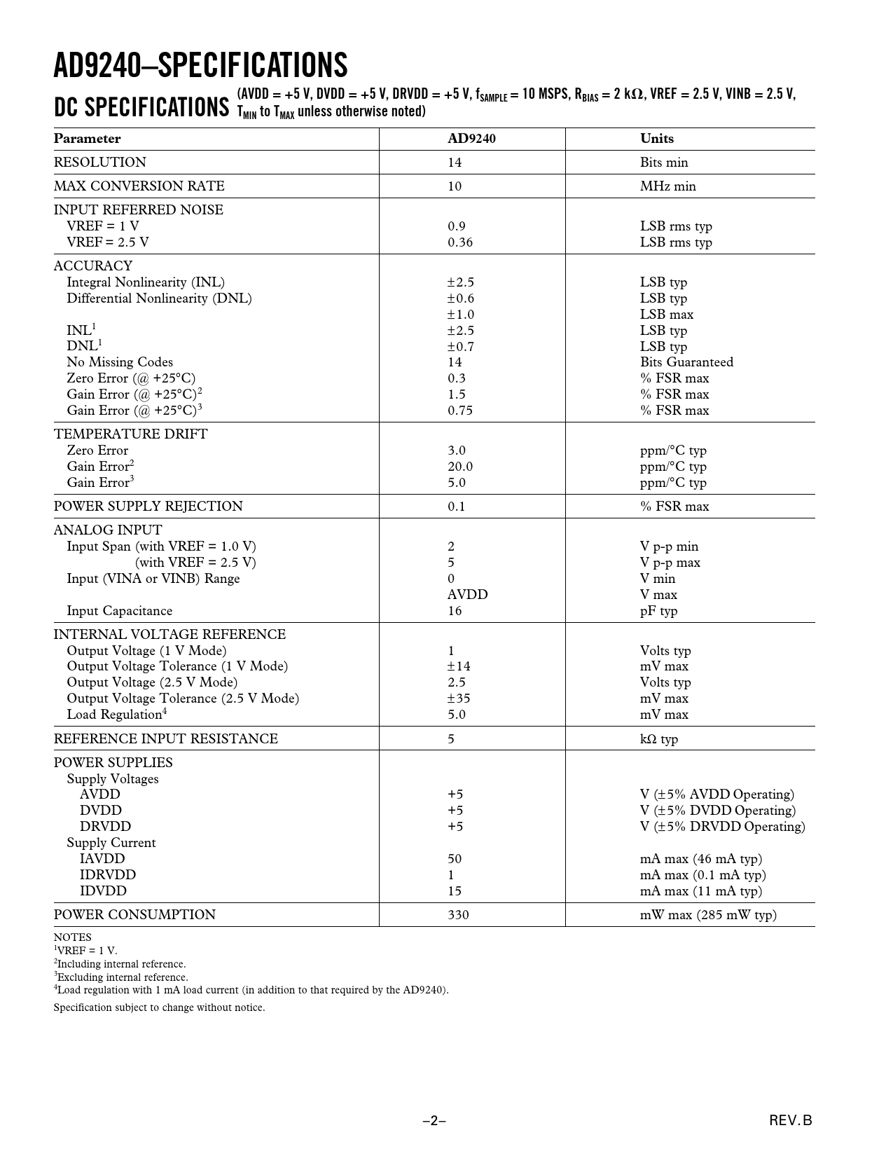 AD9240–SPECIFICATIONS(AVDD = +5 V, DVDD = +5 V, DRVDD = +5 V, fDC SPECIFICATIONSSAMPLE = 10 MSPS, RBIAS = 2 k ⍀ , VREF = 2.5 V, VINB = 2.5 V,TMIN to TMAX unless otherwise noted)ParameterAD9240Units RESOLUTION 14 Bits min MAX CONVERSION RATE 10 MHz min INPUT REFERRED NOISE VREF = 1 V 0.9 LSB rms typ VREF = 2.5 V 0.36 LSB rms typ ACCURACY Integral Nonlinearity (INL) ±2.5 LSB typ Differential Nonlinearity (DNL) ±0.6 LSB typ ±1.0 LSB max INL1 ±2.5 LSB typ DNL1 ±0.7 LSB typ No Missing Codes 14 Bits Guaranteed Zero Error (@ +25°C) 0.3 % FSR max Gain Error (@ +25°C)2 1.5 % FSR max Gain Error (@ +25°C)3 0.75 % FSR max TEMPERATURE DRIFT Zero Error 3.0 ppm/°C typ Gain Error2 20.0 ppm/°C typ Gain Error3 5.0 ppm/°C typ POWER SUPPLY REJECTION 0.1 % FSR max ANALOG INPUT Input Span (with VREF = 1.0 V) 2 V p-p min Input Span (with VREF = 2.5 V) 5 V p-p max Input (VINA or VINB) Range 0 V min AVDD V max Input Capacitance 16 pF typ INTERNAL VOLTAGE REFERENCE Output Voltage (1 V Mode) 1 Volts typ Output Voltage Tolerance (1 V Mode) ±14 mV max Output Voltage (2.5 V Mode) 2.5 Volts typ Output Voltage Tolerance (2.5 V Mode) ±35 mV max Load Regulation4 5.0 mV max REFERENCE INPUT RESISTANCE 5 kΩ typ POWER SUPPLIES Supply Voltages AVDD +5 V (± 5% AVDD Operating) DVDD +5 V (± 5% DVDD Operating) DRVDD +5 V (± 5% DRVDD Operating) Supply Current IAVDD 50 mA max (46 mA typ) IDRVDD 1 mA max (0.1 mA typ) IDVDD 15 mA max (11 mA typ) POWER CONSUMPTION 330 mW max (285 mW typ) NOTES 1VREF = 1 V. 2Including internal reference. 3Excluding internal reference. 4Load regulation with 1 mA load current (in addition to that required by the AD9240). Specification subject to change without notice. –2– REV. B