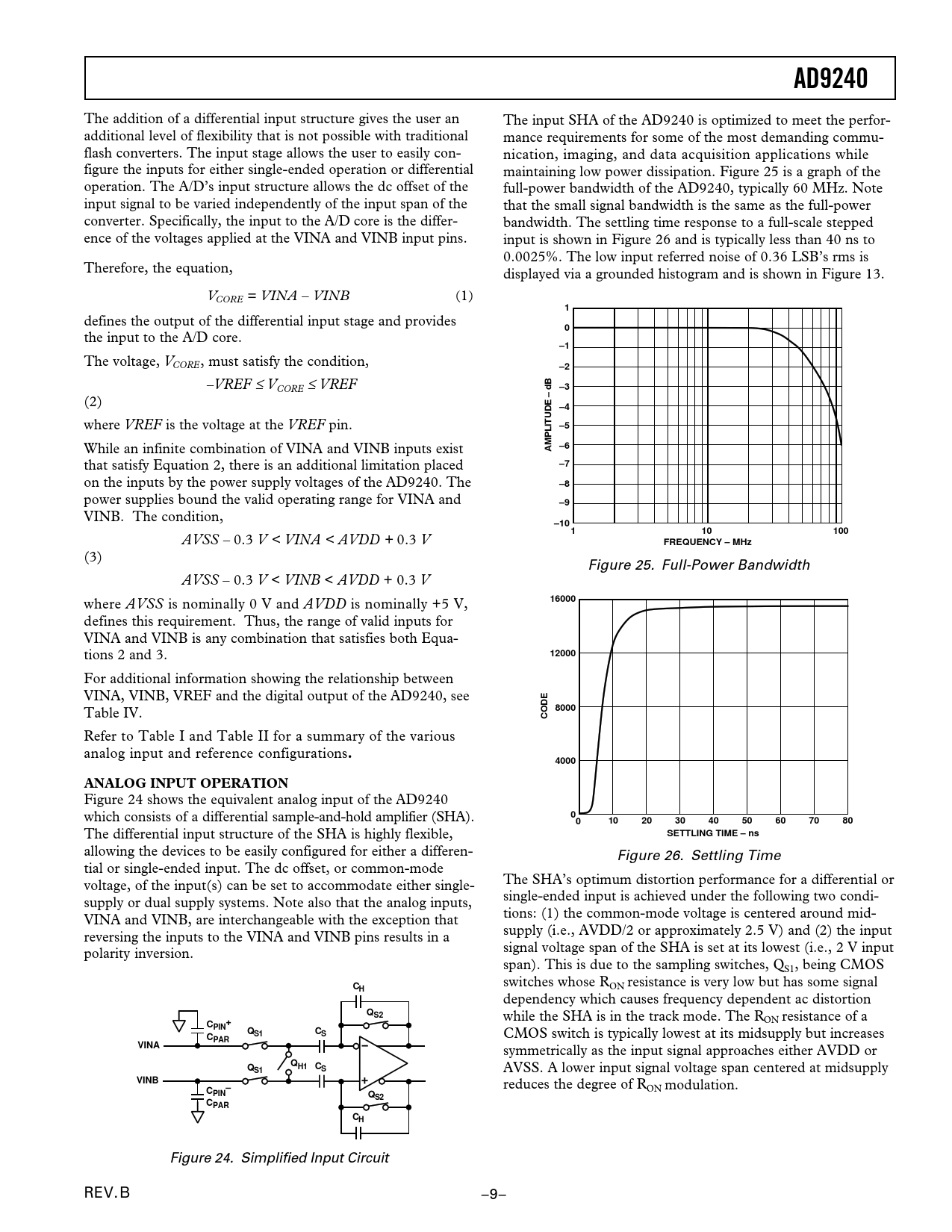 AD9240 The addition of a differential input structure gives the user an The input SHA of the AD9240 is optimized to meet the perfor- additional level of flexibility that is not possible with traditional mance requirements for some of the most demanding commu- flash converters. The input stage allows the user to easily con- nication, imaging, and data acquisition applications while figure the inputs for either single-ended operation or differential maintaining low power dissipation. Figure 25 is a graph of the operation. The A/D’s input structure allows the dc offset of the full-power bandwidth of the AD9240, typically 60 MHz. Note input signal to be varied independently of the input span of the that the small signal bandwidth is the same as the full-power converter. Specifically, the input to the A/D core is the differ- bandwidth. The settling time response to a full-scale stepped ence of the voltages applied at the VINA and VINB input pins. input is shown in Figure 26 and is typically less than 40 ns to 0.0025%. The low input referred noise of 0.36 LSB’s rms is Therefore, the equation, displayed via a grounded histogram and is shown in Figure 13. VCORE = VINA – VINB (1) 1 defines the output of the differential input stage and provides 0 the input to the A/D core. –1 The voltage, VCORE, must satisfy the condition, –2 –VREF ≤ VCORE ≤ VREF –3 (2) –4 where VREF is the voltage at the VREF pin. –5 While an infinite combination of VINA and VINB inputs exist –6AMPLITUDE – dB that satisfy Equation 2, there is an additional limitation placed –7 on the inputs by the power supply voltages of the AD9240. The –8 power supplies bound the valid operating range for VINA and –9 VINB. The condition, –10 110100 AVSS – 0.3 V < VINA < AVDD + 0.3 V FREQUENCY – MHz (3) Figure 25. Full-Power Bandwidth AVSS – 0.3 V < VINB < AVDD + 0.3 V where AVSS is nominally 0 V and AVDD is nominally +5 V, 16000 defines this requirement. Thus, the range of valid inputs for VINA and VINB is any combination that satisfies both Equa- tions 2 and 3. 12000 For additional information showing the relationship between VINA, VINB, VREF and the digital output of the AD9240, see Table IV. 8000CODE Refer to Table I and Table II for a summary of the various analog input and reference configurations .4000ANALOG INPUT OPERATION Figure 24 shows the equivalent analog input of the AD9240 which consists of a differential sample-and-hold amplifier (SHA). 001020304050607080 The differential input structure of the SHA is highly flexible, SETTLING TIME – ns allowing the devices to be easily configured for either a differen- Figure 26. Settling Time tial or single-ended input. The dc offset, or common-mode voltage, of the input(s) can be set to accommodate either single- The SHA’s optimum distortion performance for a differential or supply or dual supply systems. Note also that the analog inputs, single-ended input is achieved under the following two condi- VINA and VINB, are interchangeable with the exception that tions: (1) the common-mode voltage is centered around mid- reversing the inputs to the VINA and VINB pins results in a supply (i.e., AVDD/2 or approximately 2.5 V) and (2) the input polarity inversion. signal voltage span of the SHA is set at its lowest (i.e., 2 V input span). This is due to the sampling switches, QS1, being CMOS C switches whose R H ON resistance is very low but has some signal dependency which causes frequency dependent ac distortion QS2 while the SHA is in the track mode. The RON resistance of a C+PINQCCS1S CMOS switch is typically lowest at its midsupply but increases PARVINA symmetrically as the input signal approaches either AVDD or QQH1 CS1S AVSS. A lower input signal voltage span centered at midsupply VINB reduces the degree of R C– ON modulation. PINQS2CPARCH Figure 24. Simplified Input Circuit REV. B –9–