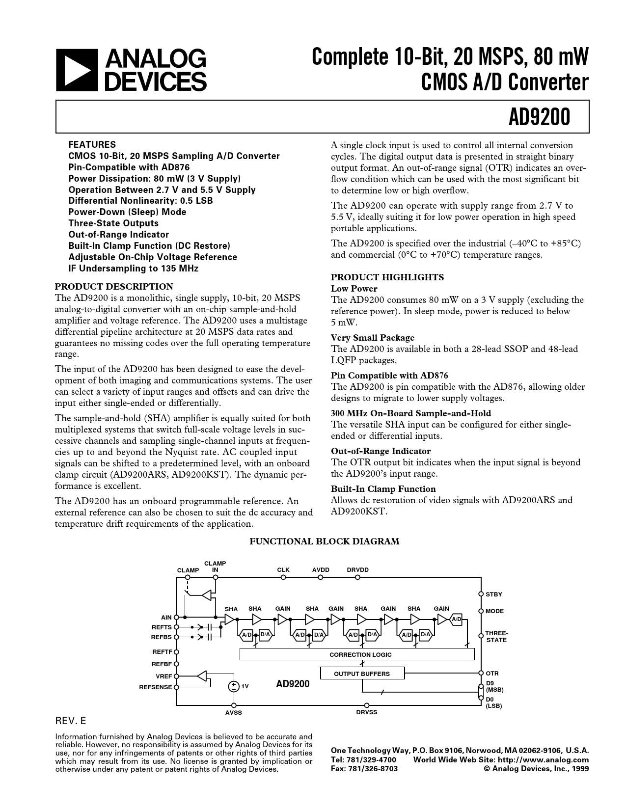 The AD9200 is a monolithic, single supply, 10-bit, 20 MSPS The AD9200 consumes 80 mW on a 3 V supply (excluding the analog-to-digital converter with an on-chip sample-and-hold reference power). In sleep mode, power is reduced to below amplifier and voltage reference. The AD9200 uses a multistage 5 mW. differential pipeline architecture at 20 MSPS data rates and