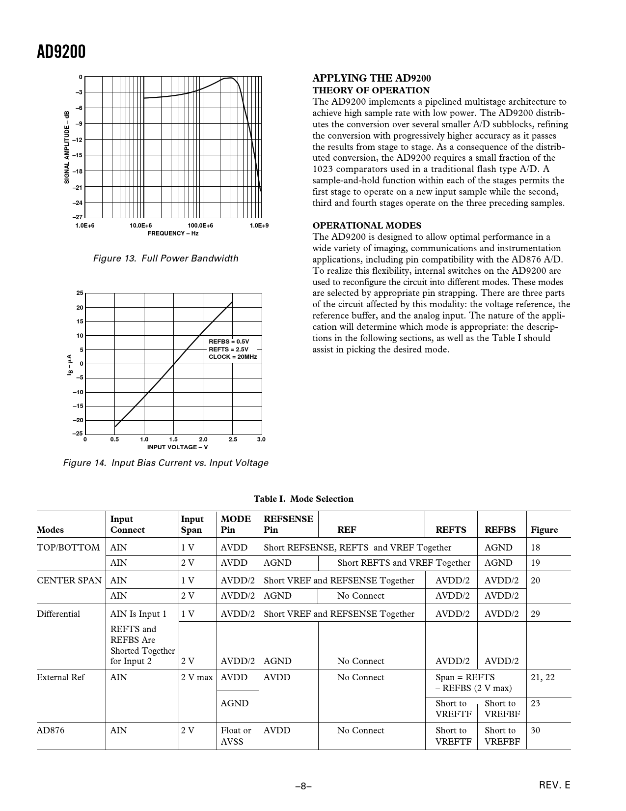 The AD9200 is designed to allow optimal performance in a wide variety of imaging, communications and instrumentation Figure 13. Full Power Bandwidth applications, including pin compatibility with the AD876 A/D. To realize this flexibility, internal switches on the AD9200 are used to reconfigure the circuit into different modes. These modes