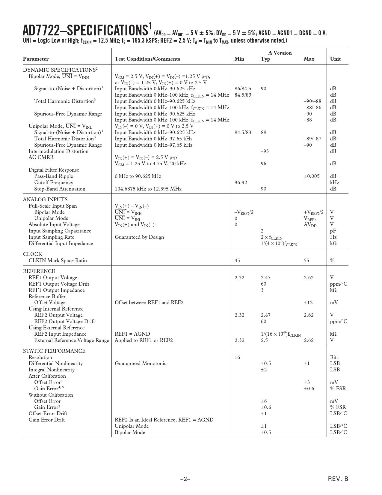 AD7722–SPECIFICATIONS1 (AVDD = AVDD1 = 5 V. 5%; DVDD = 5 V. 5%; AGND = AGND1 = DGND = 0 V;