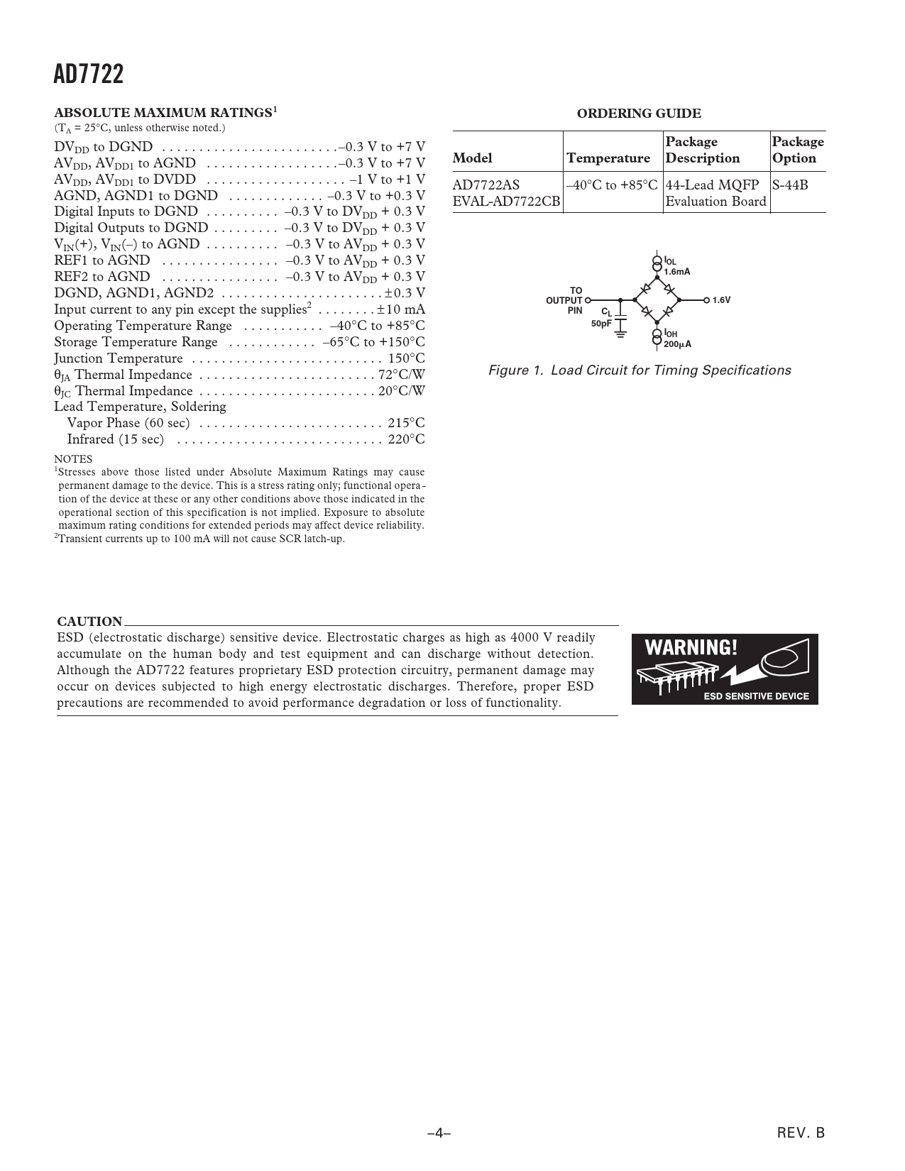 AD7722. ABSOLUTE MAXIMUM RATINGS1. ORDERING GUIDE. Package. Model. Temperature. Description. Option. 1.6mA. OUTPUT. 1.6V. PIN. 50pF. IOH. 200