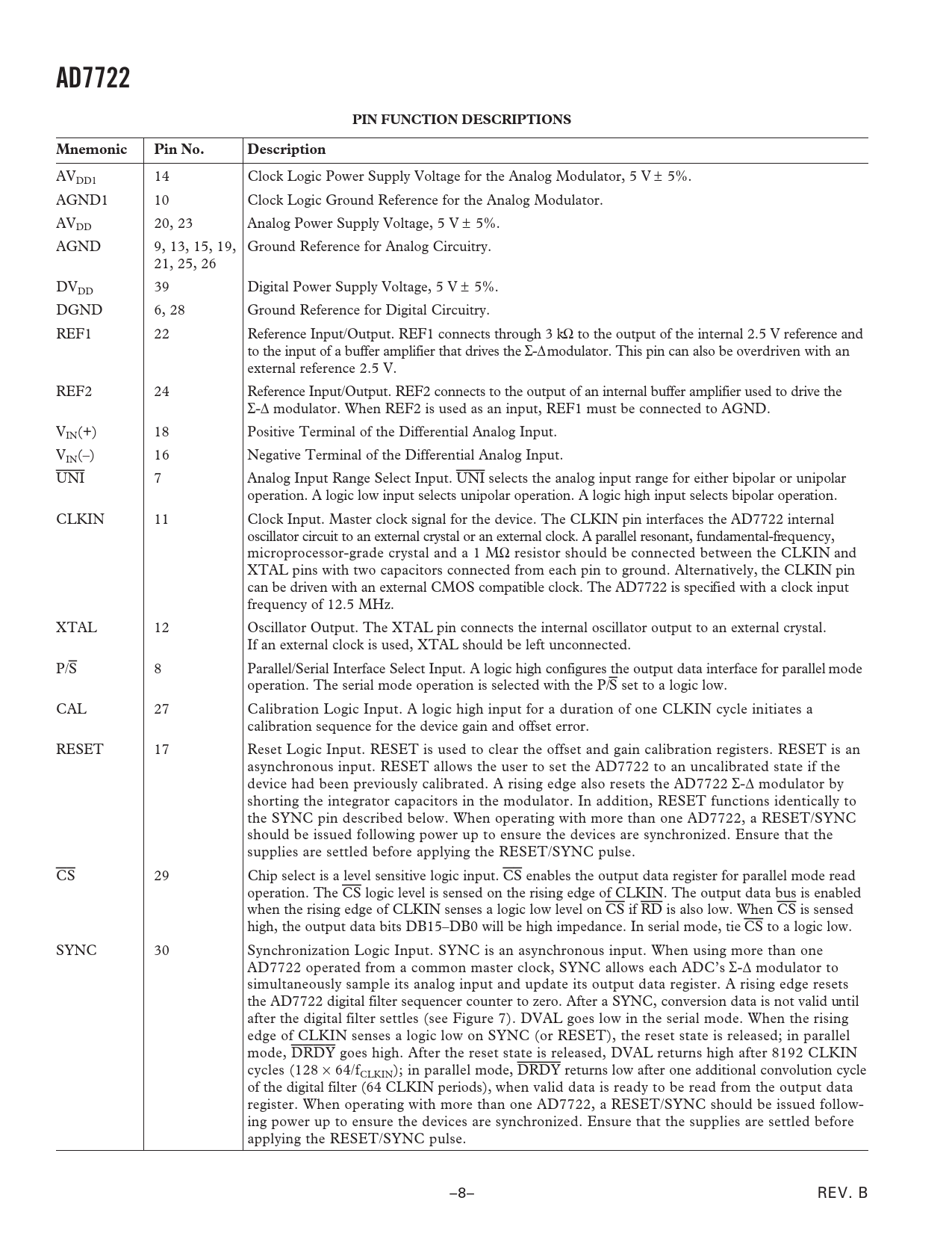 AD7722 PIN FUNCTION DESCRIPTIONS Mnemonic Pin No Description