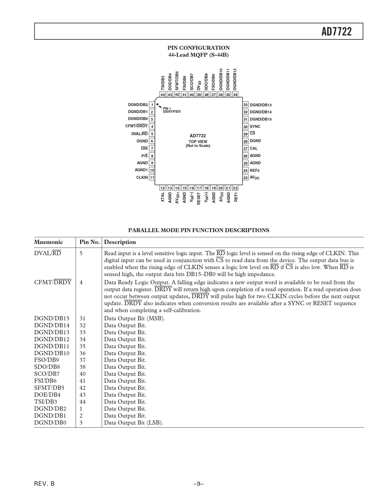 AD7722. PIN CONFIGURATION. 44-Lead MQFP (S-44B). TSI/DB3. DOE/DB4. SFMT/DB5. FSI/DB6. SCO/DB7. SDO/DB8. FSO/DB9. DGND/DB10. DGND/DB11