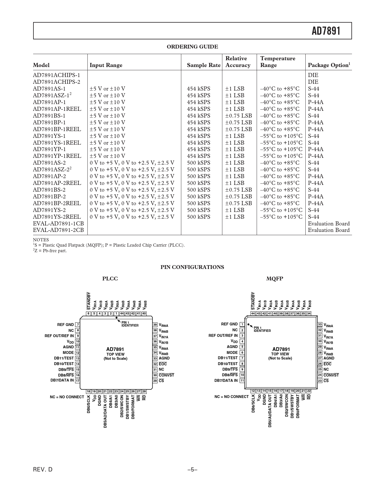 AD7891ACHIPS-1 DIE AD7891ACHIPS-2 DIE AD7891AS-1 ±5 V or ±10 V 454 kSPS ±1 LSB –40∞C to +85∞C S-44 AD7891ASZ-12 ±5 V or ±10 V 454 kSPS ±1 LSB –40∞C to +85∞C S-44 AD7891AP-1 ±5 V or ±10 V 454 kSPS ±1 LSB –40∞C to +85∞C P-44A AD7891AP-1REEL ±5 V or ±10 V 454 kSPS ±1 LSB –40∞C to +85∞C P-44A AD7891BS-1 ±5 V or ±10 V 454 kSPS ±0.75 LSB –40∞C to +85∞C S-44 AD7891BP-1 ±5 V or ±10 V 454 kSPS ±0.75 LSB –40∞C to +85∞C P-44A AD7891BP-1REEL ±5 V or ±10 V 454 kSPS ±0.75 LSB –40∞C to +85∞C P-44A AD7891YS-1 ±5 V or ±10 V 454 kSPS ±1 LSB –55∞C to +105∞C S-44 AD7891YS-1REEL ±5 V or ±10 V 454 kSPS ±1 LSB –55∞C to +105∞C S-44 AD7891YP-1 ±5 V or ±10 V 454 kSPS ±1 LSB –55∞C to +105∞C P-44A AD7891YP-1REEL ±5 V or ±10 V 454 kSPS ±1 LSB –55∞C to +105∞C P-44A AD7891AS-2 0 V to +5 V, 0 V to +2.5 V, ± 2.5 V 500 kSPS ±1 LSB –40∞C to +85∞C S-44 AD7891ASZ-22 0 V to +5 V, 0 V to +2.5 V, ± 2.5 V 500 kSPS ±1 LSB –40∞C to +85∞C S-44 AD7891AP-2 0 V to +5 V, 0 V to +2.5 V, ± 2.5 V 500 kSPS ±1 LSB –40∞C to +85∞C P-44A AD7891AP-2REEL 0 V to +5 V, 0 V to +2.5 V, ± 2.5 V 500 kSPS ±1 LSB –40∞C to +85∞C P-44A AD7891BS-2 0 V to +5 V, 0 V to +2.5 V, ± 2.5 V 500 kSPS ±0.75 LSB –40∞C to +85∞C S-44 AD7891BP-2 0 V to +5 V, 0 V to +2.5 V, ± 2.5 V 500 kSPS ±0.75 LSB –40∞C to +85∞C P-44A AD7891BP-2REEL 0 V to +5 V, 0 V to +2.5 V, ± 2.5 V 500 kSPS ±0.75 LSB –40∞C to +85∞C P-44A AD7891YS-2 0 V to +5 V, 0 V to +2.5 V, ± 2.5 V 500 kSPS ±1 LSB –55∞C to +105∞C S-44 AD7891YS-2REEL 0 V to +5 V, 0 V to +2.5 V, ± 2.5 V 500 kSPS ±1 LSB –55∞C to +105∞C S-44 EVAL-AD7891-1CB Evaluation Board EVAL-AD7891-2CB Evaluation Board NOTES 1S = Plastic Quad Flatpack (MQFP); P = Plastic Leaded Chip Carrier (PLCC). 2Z = Pb-free part.