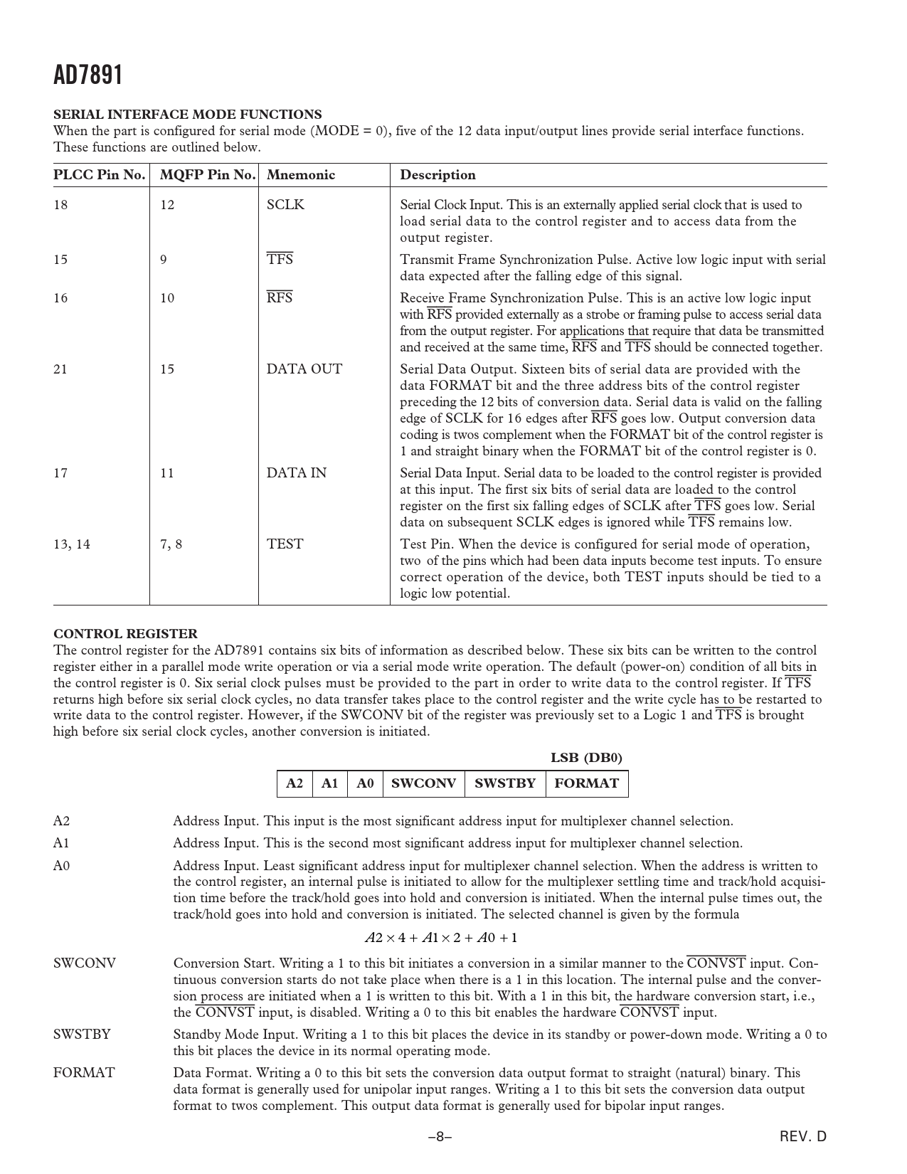 AD7891 SERIAL INTERFACE MODE FUNCTIONS PLCC Pin No MQFP Pin No Mnemonic Description CONTROL REGISTER