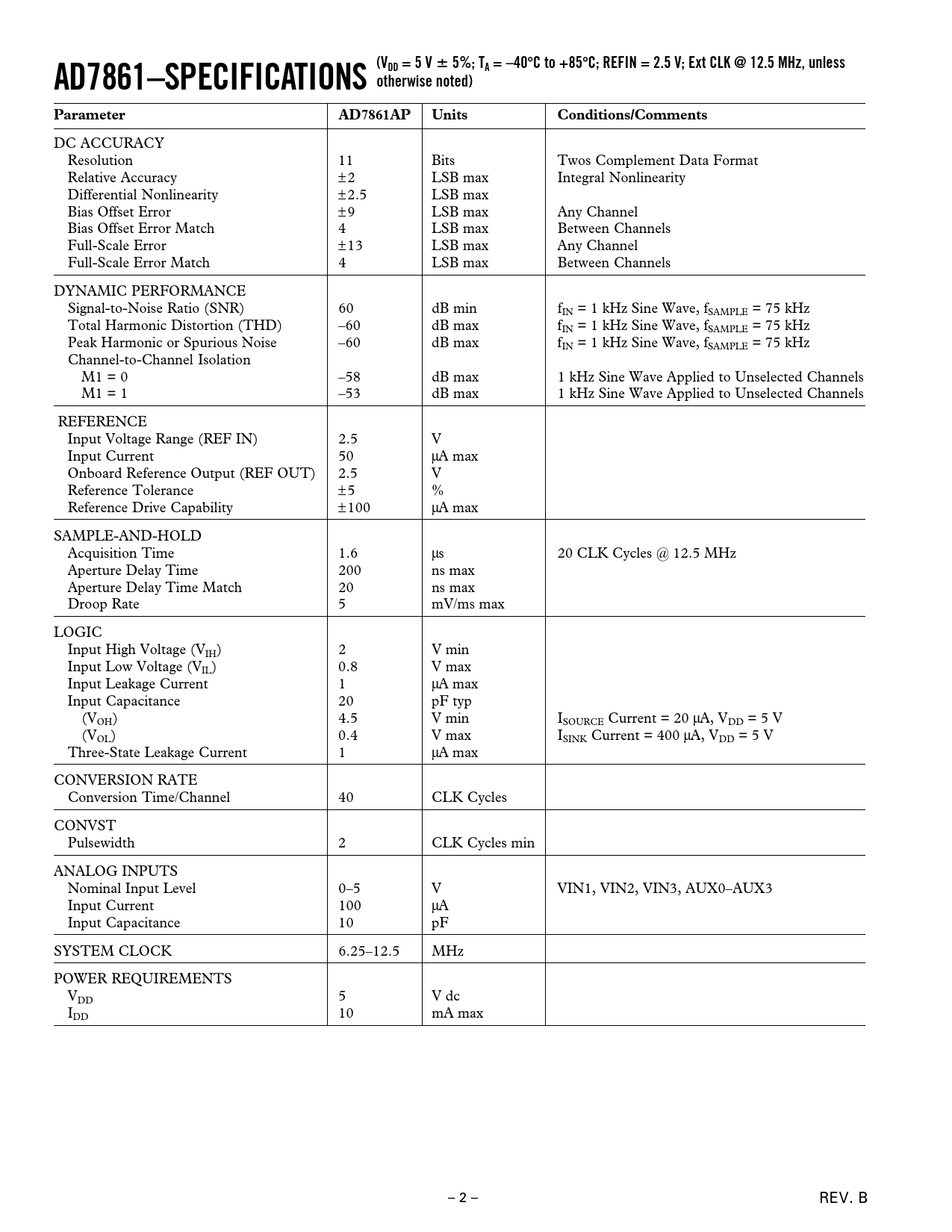 C; REFIN = 2.5 V; Ext CLK @ 12.5 MHz, unless otherwise noted) Parameter AD7861AP Units Conditions/Comments