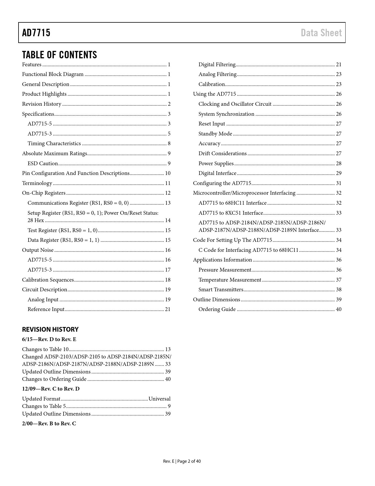 link to page 1 link to page 1 link to page 1 link to page 1 link to page 3 link to page 4 link to page 4 link to page 6 link to page 9 link to page 10 link to page 10 link to page 11 link to page 12 link to page 13 link to page 14 link to page 15 link to page 15 link to page 16 link to page 16 link to page 17 link to page 17 link to page 18 link to page 19 link to page 20 link to page 20 link to page 22 link to page 22 link to page 24 link to page 24 link to page 27 link to page 27 link to page 27 link to page 28 link to page 28 link to page 28 link to page 28 link to page 29 link to page 30 link to page 32 link to page 33 link to page 33 link to page 34 link to page 34 link to page 35 link to page 35 link to page 37 link to page 37 link to page 38 link to page 39 link to page 40 link to page 41 AD7715Data SheetTABLE OF CONTENTS Features .. 1 Digital Filtering... 21 Functional Block Diagram .. 1 Analog Filtering .. 23 General Description ... 1 Calibration ... 23 Product Highlights ... 1 Using the AD7715 .. 26 Revision History ... 2 Clocking and Oscillator Circuit ... 26 Specifications ... 3 System Synchronization .. 26 AD7715-5 .. 3 Reset Input .. 27 AD7715-3 .. 5 Standby Mode ... 27 Timing Characteristics .. 8 Accuracy .. 27 Absolute Maximum Ratings .. 9 Drift Considerations .. 27 ESD Caution .. 9 Power Supplies .. 28 Pin Configuration And Function Descriptions .. 10 Digital Interface .. 29 Terminology .. 11 Configuring the AD7715 ... 31 On-Chip Registers .. 12 Microcontroller/Microprocessor Interfacing ... 32 Communications Register (RS1, RS0 = 0, 0) .. 13 AD7715 to 68HC11 Interface ... 32 Setup Register (RS1, RS0 = 0, 1); Power On/Reset Status: AD7715 to 8XC51 Interface .. 33 28 Hex .. 14 AD7715 to ADSP-2184N/ADSP-2185N/ADSP-2186N/ Test Register (RS1, RS0 = 1, 0) .. 15 ADSP-2187N/ADSP-2188N/ADSP-2189N Interface.. 33 Data Register (RS1, RS0 = 1, 1) .. 15 Code For Setting Up The AD7715 ... 34 Output Noise ... 16 C Code for Interfacing AD7715 to 68HC11 ... 34 AD7715-5 .. 16 Applications Information .. 36 AD7715-3 .. 17 Pressure Measurement ... 36 Calibration Sequences .. 18 Temperature Measurement ... 37 Circuit Description ... 19 Smart Transmitters ... 38 Analog Input ... 19 Outline Dimensions ... 39 Reference Input ... 21 Ordering Guide .. 40 REVISION HISTORY6/15—Rev. D to Rev. E Changes to Table 10 .. 13 Changed ADSP-2103/ADSP-2105 to ADSP-2184N/ADSP-2185N/ ADSP-2186N/ADSP-2187N/ADSP-2188N/ADSP-2189N ... 33 Updated Outline Dimensions ... 39 Changes to Ordering Guide .. 40 12/09—Rev. C to Rev. D Updated Format .. Universal Changes to Table 5 .. 9 Updated Outline Dimensions ... 39 2/00—Rev. B to Rev. C Rev. E | Page 2 of 40 Document Outline FEATURES FUNCTIONAL BLOCK DIAGRAM GENERAL DESCRIPTION PRODUCT HIGHLIGHTS TABLE OF CONTENTS REVISION HISTORY SPECIFICATIONS AD7715-5 AD7715-3 TIMING CHARACTERISTICS ABSOLUTE MAXIMUM RATINGS ESD CAUTION PIN CONFIGURATION AND FUNCTION DESCRIPTIONS TERMINOLOGY ON-CHIP REGISTERS COMMUNICATIONS REGISTER (RS1, RS0 = 0, 0) SETUP REGISTER (RS1, RS0 = 0, 1); POWER ON/RESET STATUS: 28 HEX TEST REGISTER (RS1, RS0 = 1, 0) DATA REGISTER (RS1, RS0 = 1, 1) OUTPUT NOISE AD7715-5 AD7715-3 CALIBRATION SEQUENCES CIRCUIT DESCRIPTION ANALOG INPUT Analog Input Ranges Input Sample Rate Bipolar/Unipolar Inputs REFERENCE INPUT DIGITAL FILTERING Filter Characteristics Post-Filtering ANALOG FILTERING CALIBRATION Self-Calibration System Calibration Span and Offset Limits Power-Up and Calibration USING THE AD7715 CLOCKING AND OSCILLATOR CIRCUIT SYSTEM SYNCHRONIZATION RESET INPUT STANDBY MODE ACCURACY DRIFT CONSIDERATIONS POWER SUPPLIES Supply Current Grounding and Layout Evaluating the AD7715 Performance DIGITAL INTERFACE CONFIGURING THE AD7715 MICROCONTROLLER/MICROPROCESSOR INTERFACING AD7715 TO 68HC11 INTERFACE AD7715 TO 8XC51 INTERFACE AD7715 TO ADSP-2184N/ADSP-2185N/ ADSP-2186N/ADSP-2187N/ADSP-2188N/ ADSP-2189N INTERFACE CODE FOR SETTING UP THE AD7715 C CODE FOR INTERFACING AD7715 TO 68HC11 APPLICATIONS INFORMATION PRESSURE MEASUREMENT TEMPERATURE MEASUREMENT SMART TRANSMITTERS OUTLINE DIMENSIONS ORDERING GUIDE