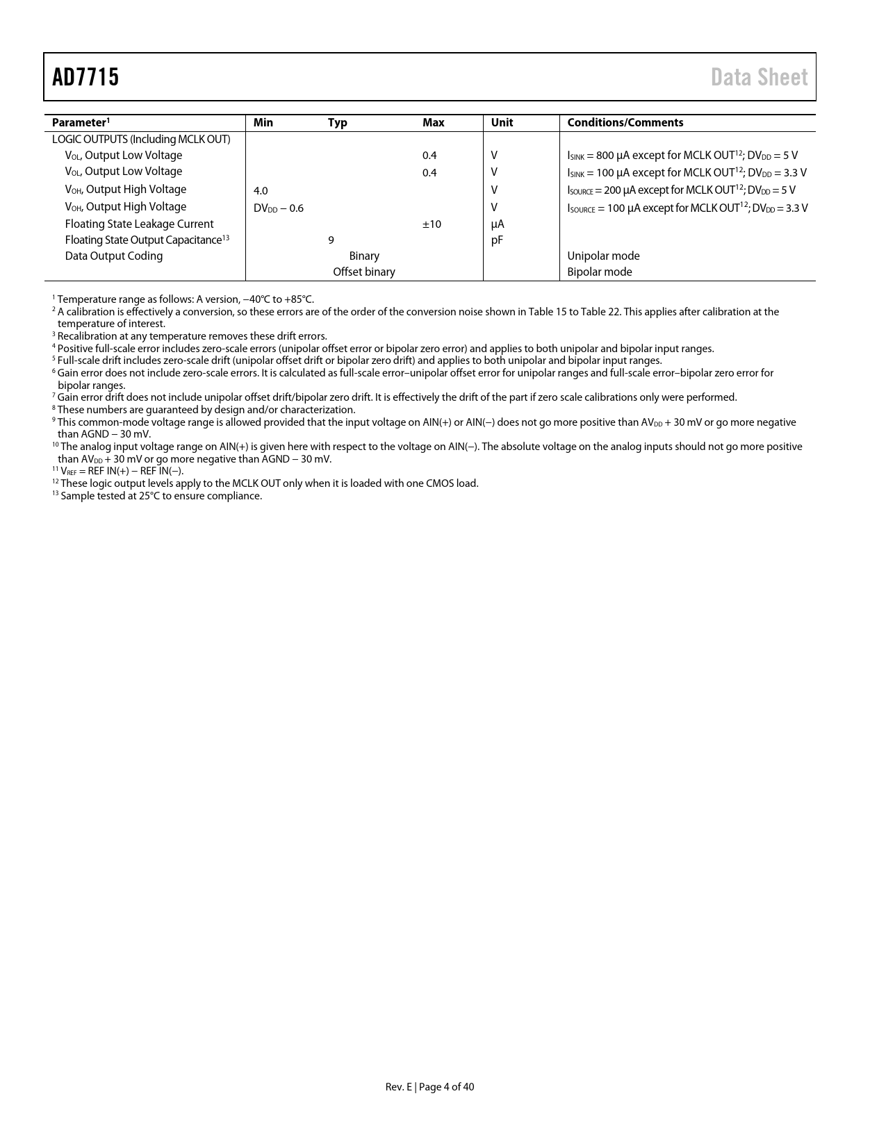 link to page 17 link to page 18 link to page 5 link to page 5 link to page 5 link to page 5 AD7715Data SheetParameter1MinTypMaxUnitConditions/Comments LOGIC OUTPUTS (Including MCLK OUT) VOL, Output Low Voltage 0.4 V ISINK = 800 µA except for MCLK OUT12; DVDD = 5 V VOL, Output Low Voltage 0.4 V ISINK = 100 µA except for MCLK OUT12; DVDD = 3.3 V VOH, Output High Voltage 4.0 V ISOURCE = 200 µA except for MCLK OUT12; DVDD = 5 V VOH, Output High Voltage DVDD − 0.6 V ISOURCE = 100 µA except for MCLK OUT12; DVDD = 3.3 V Floating State Leakage Current ±10 µA Floating State Output Capacitance13 9 pF Data Output Coding Binary Unipolar mode Offset binary Bipolar mode 1 Temperature range as follows: A version, −40°C to +85°C. 2 A calibration is effectively a conversion, so these errors are of the order of the conversion noise shown in Table 15 to Table 22. This applies after calibration at the temperature of interest. 3 Recalibration at any temperature removes these drift errors. 4 Positive full-scale error includes zero-scale errors (unipolar offset error or bipolar zero error) and applies to both unipolar and bipolar input ranges. 5 Full-scale drift includes zero-scale drift (unipolar offset drift or bipolar zero drift) and applies to both unipolar and bipolar input ranges. 6 Gain error does not include zero-scale errors. It is calculated as ful -scale error–unipolar offset error for unipolar ranges and full-scale error–bipolar zero error for bipolar ranges. 7 Gain error drift does not include unipolar offset drift/bipolar zero drift. It is effectively the drift of the part if zero scale calibrations only were performed. 8 These numbers are guaranteed by design and/or characterization. 9 This common-mode voltage range is allowed provided that the input voltage on AIN(+) or AIN(−) does not go more positive than AVDD + 30 mV or go more negative than AGND − 30 mV. 10 The analog input voltage range on AIN(+) is given here with respect to the voltage on AIN(−). The absolute voltage on the analog inputs should not go more positive than AVDD + 30 mV or go more negative than AGND − 30 mV. 11 VREF = REF IN(+) − REF IN(−). 12 These logic output levels apply to the MCLK OUT only when it is loaded with one CMOS load. 13 Sample tested at 25°C to ensure compliance. Rev. E | Page 4 of 40 Document Outline FEATURES FUNCTIONAL BLOCK DIAGRAM GENERAL DESCRIPTION PRODUCT HIGHLIGHTS TABLE OF CONTENTS REVISION HISTORY SPECIFICATIONS AD7715-5 AD7715-3 TIMING CHARACTERISTICS ABSOLUTE MAXIMUM RATINGS ESD CAUTION PIN CONFIGURATION AND FUNCTION DESCRIPTIONS TERMINOLOGY ON-CHIP REGISTERS COMMUNICATIONS REGISTER (RS1, RS0 = 0, 0) SETUP REGISTER (RS1, RS0 = 0, 1); POWER ON/RESET STATUS: 28 HEX TEST REGISTER (RS1, RS0 = 1, 0) DATA REGISTER (RS1, RS0 = 1, 1) OUTPUT NOISE AD7715-5 AD7715-3 CALIBRATION SEQUENCES CIRCUIT DESCRIPTION ANALOG INPUT Analog Input Ranges Input Sample Rate Bipolar/Unipolar Inputs REFERENCE INPUT DIGITAL FILTERING Filter Characteristics Post-Filtering ANALOG FILTERING CALIBRATION Self-Calibration System Calibration Span and Offset Limits Power-Up and Calibration USING THE AD7715 CLOCKING AND OSCILLATOR CIRCUIT SYSTEM SYNCHRONIZATION RESET INPUT STANDBY MODE ACCURACY DRIFT CONSIDERATIONS POWER SUPPLIES Supply Current Grounding and Layout Evaluating the AD7715 Performance DIGITAL INTERFACE CONFIGURING THE AD7715 MICROCONTROLLER/MICROPROCESSOR INTERFACING AD7715 TO 68HC11 INTERFACE AD7715 TO 8XC51 INTERFACE AD7715 TO ADSP-2184N/ADSP-2185N/ ADSP-2186N/ADSP-2187N/ADSP-2188N/ ADSP-2189N INTERFACE CODE FOR SETTING UP THE AD7715 C CODE FOR INTERFACING AD7715 TO 68HC11 APPLICATIONS INFORMATION PRESSURE MEASUREMENT TEMPERATURE MEASUREMENT SMART TRANSMITTERS OUTLINE DIMENSIONS ORDERING GUIDE