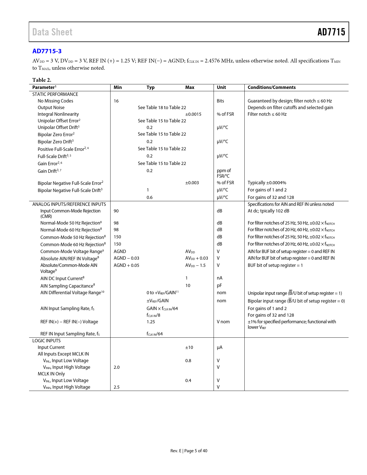 Data Sheet AD7715 AD7715-3 Table 2 Parameter1 Min Typ Max Unit Conditions/Comments