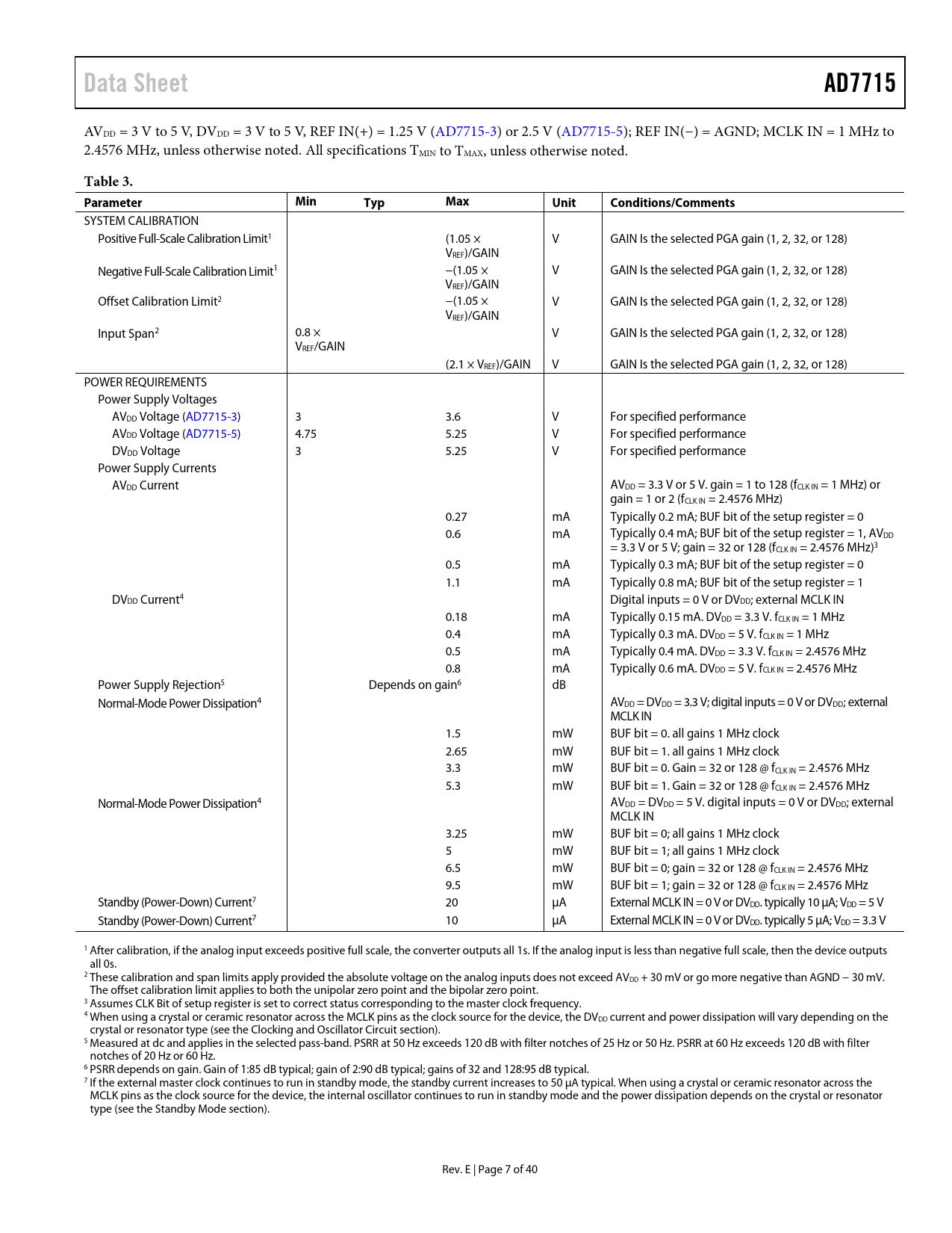 Data Sheet. AD7715. Table 3. Parameter. Min. Typ. Max. Unit. Conditions/Comments