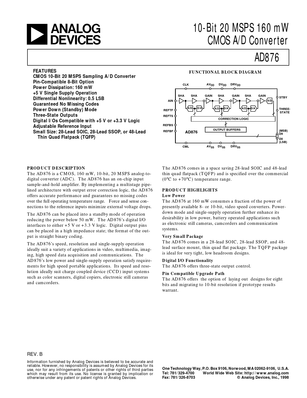 such as color scanners, digital copiers, electronic still cameras The AD876 offers the option of laying out designs for eight and camcorders. bits and migrating to 10-bit resolution if prototype results warrant. REV. B Information furnished by Analog Devices is believed to be accurate and reliable. However, no responsibility is assumed by Analog Devices for its use, nor for any infringements of patents or other rights of third parties