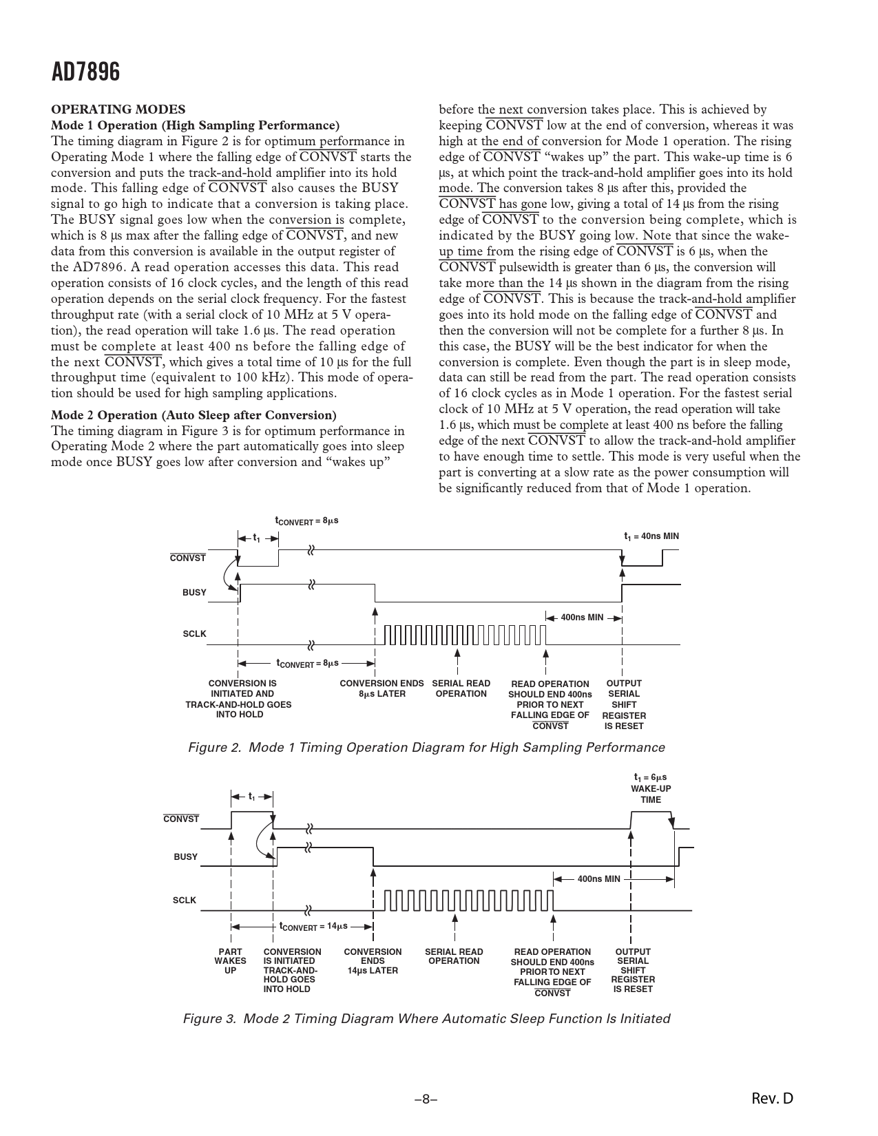 AD7896 OPERATING MODES Mode 1 Operation (High Sampling Performance) Mode 2 Operation (Auto Sleep after Conversion)