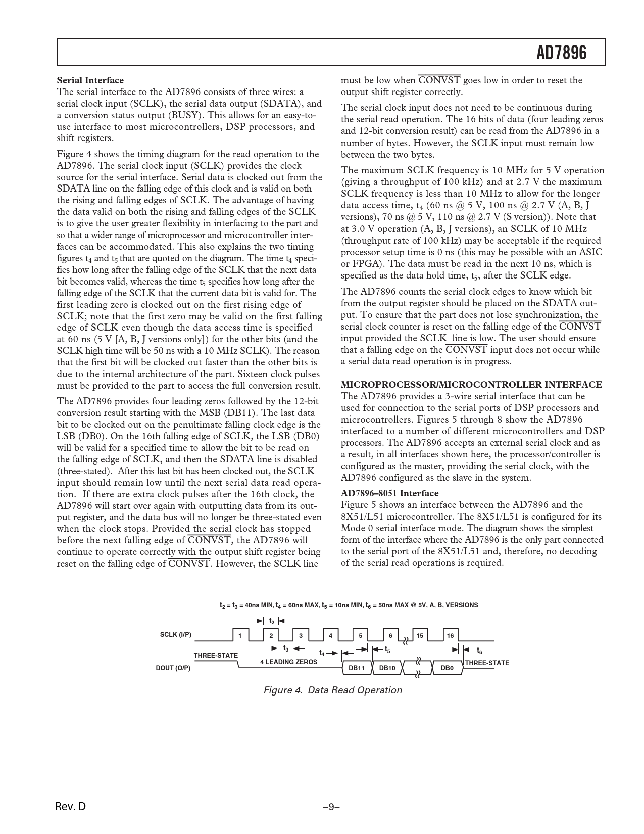 The AD7896 provides a 3-wire serial interface that can be The AD7896 provides four leading zeros followed by the 12-bit used for connection to the serial ports of DSP processors and conversion result starting with the MSB (DB11). The last data microcontrollers. Figures 5 through 8 show the AD7896 bit to be clocked out on the penultimate falling clock edge is the interfaced to a number of different microcontrollers and DSP LSB (DB0). On the 16th falling edge of SCLK, the LSB (DB0) processors. The AD7896 accepts an external serial clock and as will be valid for a specified time to allow the bit to be read on a result, in all interfaces shown here, the processor/controller is the falling edge of SCLK, and then the SDATA line is disabled configured as the master, providing the serial clock, with the (three-stated). After this last bit has been clocked out, the SCLK AD7896 configured as the slave in the system. input should remain low until the next serial data read opera- tion. If there are extra clock pulses after the 16th clock, the