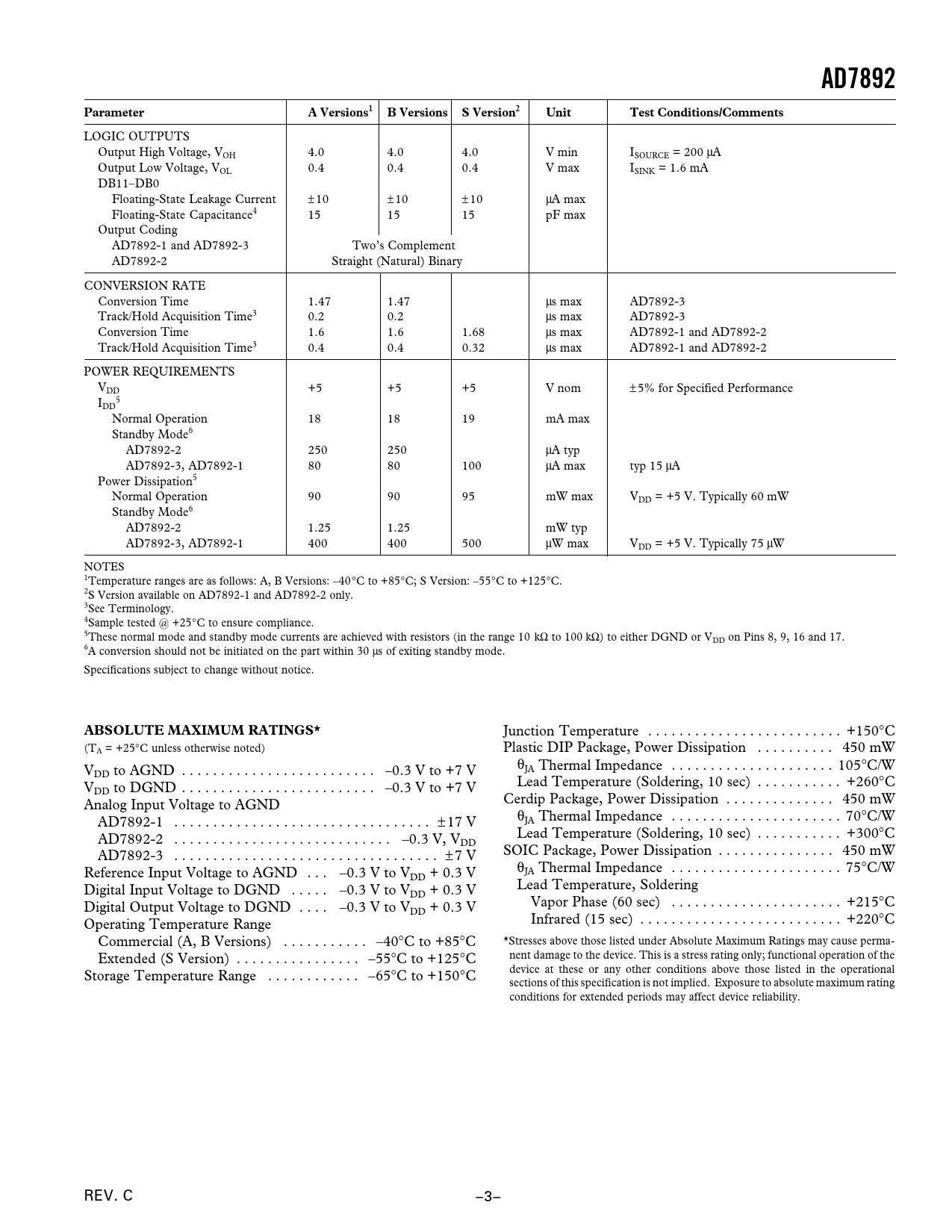 LOGIC OUTPUTS Output High Voltage, VOH 4.0 4.0 4.0 V min ISOURCE = 200 µA Output Low Voltage, VOL 0.4 0.4 0.4 V max ISINK = 1.6 mA DB11–DB0 Floating-State Leakage Current ±10 ±10 ±10 µA max Floating-State Capacitance4 15 15 15 pF max Output Coding AD7892-1 and AD7892-3 Two’s Complement AD7892-2 Straight (Natural) Binary CONVERSION RATE Conversion Time 1.47 1.47 µs max AD7892-3 Track/Hold Acquisition Time3 0.2 0.2 µs max AD7892-3 Conversion Time 1.6 1.6 1.68 µs max AD7892-1 and AD7892-2 Track/Hold Acquisition Time3 0.4 0.4 0.32 µs max AD7892-1 and AD7892-2 POWER REQUIREMENTS VDD +5 +5 +5 V nom ±5% for Specified Performance I 5 DD Normal Operation 18 18 19 mA max Standby Mode6 AD7892-2 250 250 µA typ AD7892-3, AD7892-1 80 80 100 µA max typ 15 µA Power Dissipation5 Normal Operation 90 90 95 mW max VDD = +5 V. Typically 60 mW Standby Mode6 AD7892-2 1.25 1.25 mW typ AD7892-3, AD7892-1 400 400 500 µW max VDD = +5 V. Typically 75 µW NOTES 1Temperature ranges are as follows: A, B Versions: –40°C to +85°C; S Version: –55°C to +125°C. 2S Version available on AD7892-1 and AD7892-2 only. 3See Terminology. 4Sample tested @ +25°C to ensure compliance. 5These normal mode and standby mode currents are achieved with resistors (in the range 10 kΩ to 100 kΩ) to either DGND or VDD on Pins 8, 9, 16 and 17. 6A conversion should not be initiated on the part within 30 µs of exiting standby mode. Specifications subject to change without notice.