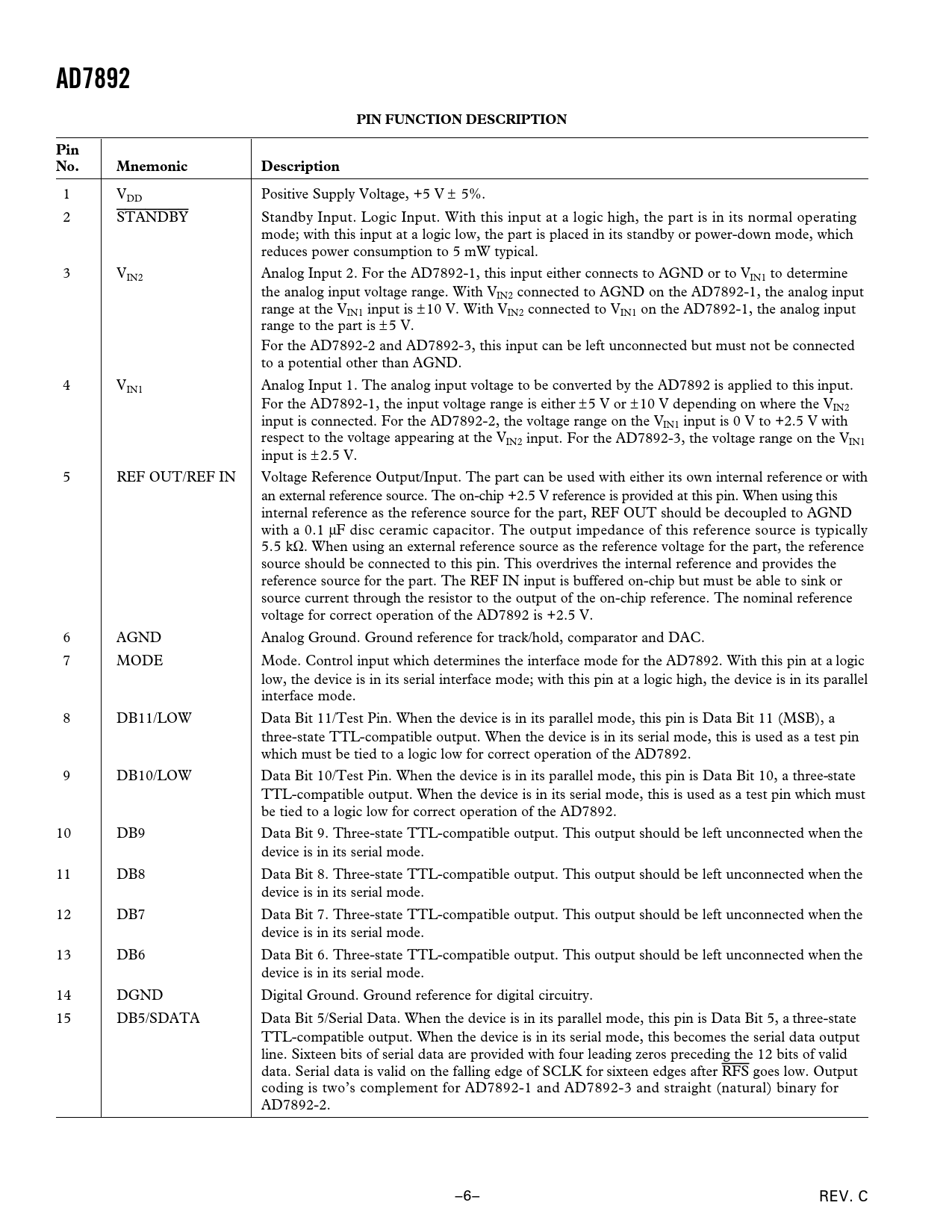 AD7892 PIN FUNCTION DESCRIPTION Pin No. Mnemonic Description