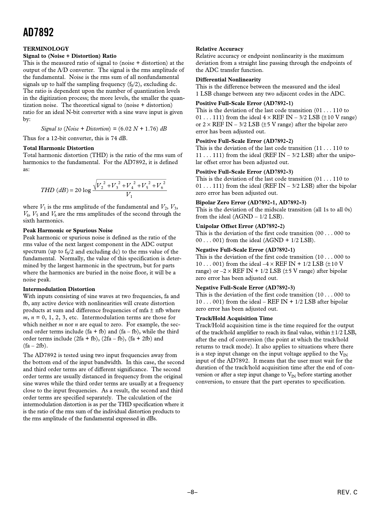 AD7892TERMINOLOGYRelative AccuracySignal to (Noise + Distortion) Ratio Relative accuracy or endpoint nonlinearity is the maximum This is the measured ratio of signal to (noise + distortion) at the deviation from a straight line passing through the endpoints of output of the A/D converter. The signal is the rms amplitude of the ADC transfer function. the fundamental. Noise is the rms sum of all nonfundamental Differential Nonlinearity signals up to half the sampling frequency (fS/2), excluding dc. This is the difference between the measured and the ideal The ratio is dependent upon the number of quantization levels 1 LSB change between any two adjacent codes in the ADC. in the digitization process; the more levels, the smaller the quan- Positive Full-Scale Error (AD7892-1) tization noise. The theoretical signal to (noise + distortion) This is the deviation of the last code transition (01 . 110 to ratio for an ideal N-bit converter with a sine wave input is given 01 . 111) from the ideal 4 by: × REF IN – 3/2 LSB (±10 V range) or 2 × REF IN – 3/2 LSB (± 5 V range) after the bipolar zero Signal to (Noise + Distortion) = (6.02 N + 1.76) dB error has been adjusted out. Thus for a 12-bit converter, this is 74 dB. Positive Full-Scale Error (AD7892-2)Total Harmonic Distortion This is the deviation of the last code transition (11 . 110 to Total harmonic distortion (THD) is the ratio of the rms sum of 11 . 111) from the ideal (REF IN – 3/2 LSB) after the unipo- harmonics to the fundamental. For the AD7892, it is defined lar offset error has been adjusted out. as: Positive Full-Scale Error (AD7892-3) This is the deviation of the last code transition (01 . 110 to 2 2 2 2 2 V +V +V +V +V 01 . 111) from the ideal (REF IN – 3/2 LSB) after the bipolar THD (dB) = 20 log 2 3 4 5 6 zero error has been adjusted out. V 1 Bipolar Zero Error (AD7892-1, AD7892-3) where V1 is the rms amplitude of the fundamental and V2, V3, This is the deviation of the midscale transition (all 1s to all 0s) V4, V5 and V6 are the rms amplitudes of the second through the from the ideal (AGND – 1/2 LSB). sixth harmonics. Unipolar Offset Error (AD7892-2)Peak Harmonic or Spurious Noise This is the deviation of the first code transition (00 . 000 to Peak harmonic or spurious noise is defined as the ratio of the 00 . 001) from the ideal (AGND + 1/2 LSB). rms value of the next largest component in the ADC output Negative Full-Scale Error (AD7892-1) spectrum (up to fS/2 and excluding dc) to the rms value of the This is the deviation of the first code transition (10 . 000 to fundamental. Normally, the value of this specification is deter- 10 . 001) from the ideal –4 mined by the largest harmonic in the spectrum, but for parts × REF IN + 1/2 LSB (±10 V range) or –2 where the harmonics are buried in the noise floor, it will be a × REF IN + 1/2 LSB (±5 V range) after bipolar zero error has been adjusted out. noise peak. Negative Full-Scale Error (AD7892-3)Intermodulation Distortion This is the deviation of the first code transition (10 . 000 to With inputs consisting of sine waves at two frequencies, fa and 10 . 001) from the ideal – REF IN + 1/2 LSB after bipolar fb, any active device with nonlinearities will create distortion zero error has been adjusted out. products at sum and difference frequencies of mfa ± nfb where m, n = 0, 1, 2, 3, etc. Intermodulation terms are those for Track/Hold Acquisition Time which neither m nor n are equal to zero. For example, the sec- Track/Hold acquisition time is the time required for the output ond order terms include (fa + fb) and (fa – fb), while the third of the track/hold amplifier to reach its final value, within ±1/2 LSB, order terms include (2fa + fb), (2fa – fb), (fa + 2fb) and after the end of conversion (the point at which the track/hold (fa – 2fb). returns to track mode). It also applies to situations where there is a step input change on the input voltage applied to the V The AD7892 is tested using two input frequencies away from IN input of the AD7892. It means that the user must wait for the the bottom end of the input bandwidth. In this case, the second duration of the track/hold acquisition time after the end of con- and third order terms are of different significance. The second version or after a step input change to V order terms are usually distanced in frequency from the original IN before starting another conversion, to ensure that the part operates to specification. sine waves while the third order terms are usually at a frequency close to the input frequencies. As a result, the second and third order terms are specified separately. The calculation of the intermodulation distortion is as per the THD specification where it is the ratio of the rms sum of the individual distortion products to the rms amplitude of the fundamental expressed in dBs. –8– REV. C