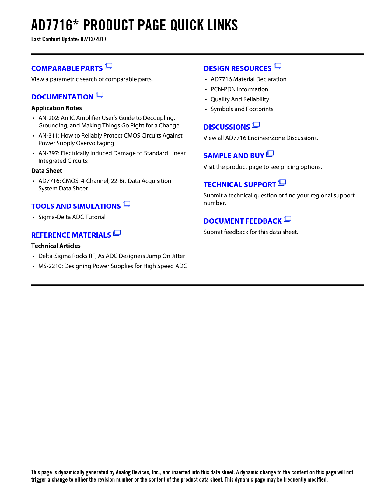 AD7716* PRODUCT PAGE QUICK LINKS Last Content Update: 07/13/2017COMPARABLE PARTSDESIGN RESOURCES View a parametric search of comparable parts. • AD7716 Material Declaration • PCN-PDN Information DOCUMENTATION • Quality And Reliability Application Notes • Symbols and Footprints • AN-202: An IC Amplifier User’s Guide to Decoupling, Grounding, and Making Things Go Right for a Change DISCUSSIONS • AN-311: How to Reliably Protect CMOS Circuits Against View all AD7716 EngineerZone Discussions. Power Supply Overvoltaging • AN-397: Electrically Induced Damage to Standard Linear SAMPLE AND BUY Integrated Circuits: Visit the product page to see pricing options. Data Sheet • AD7716: CMOS, 4-Channel, 22-Bit Data Acquisition TECHNICAL SUPPORT System Data Sheet Submit a technical question or find your regional support TOOLS AND SIMULATIONS number. • Sigma-Delta ADC Tutorial DOCUMENT FEEDBACKREFERENCE MATERIALS Submit feedback for this data sheet. Technical Articles • Delta-Sigma Rocks RF, As ADC Designers Jump On Jitter • MS-2210: Designing Power Supplies for High Speed ADC This page is dynamically generated by Analog Devices, Inc., and inserted into this data sheet. A dynamic change to the content on this page will not trigger a change to either the revision number or the content of the product data sheet. This dynamic page may be frequently modified.