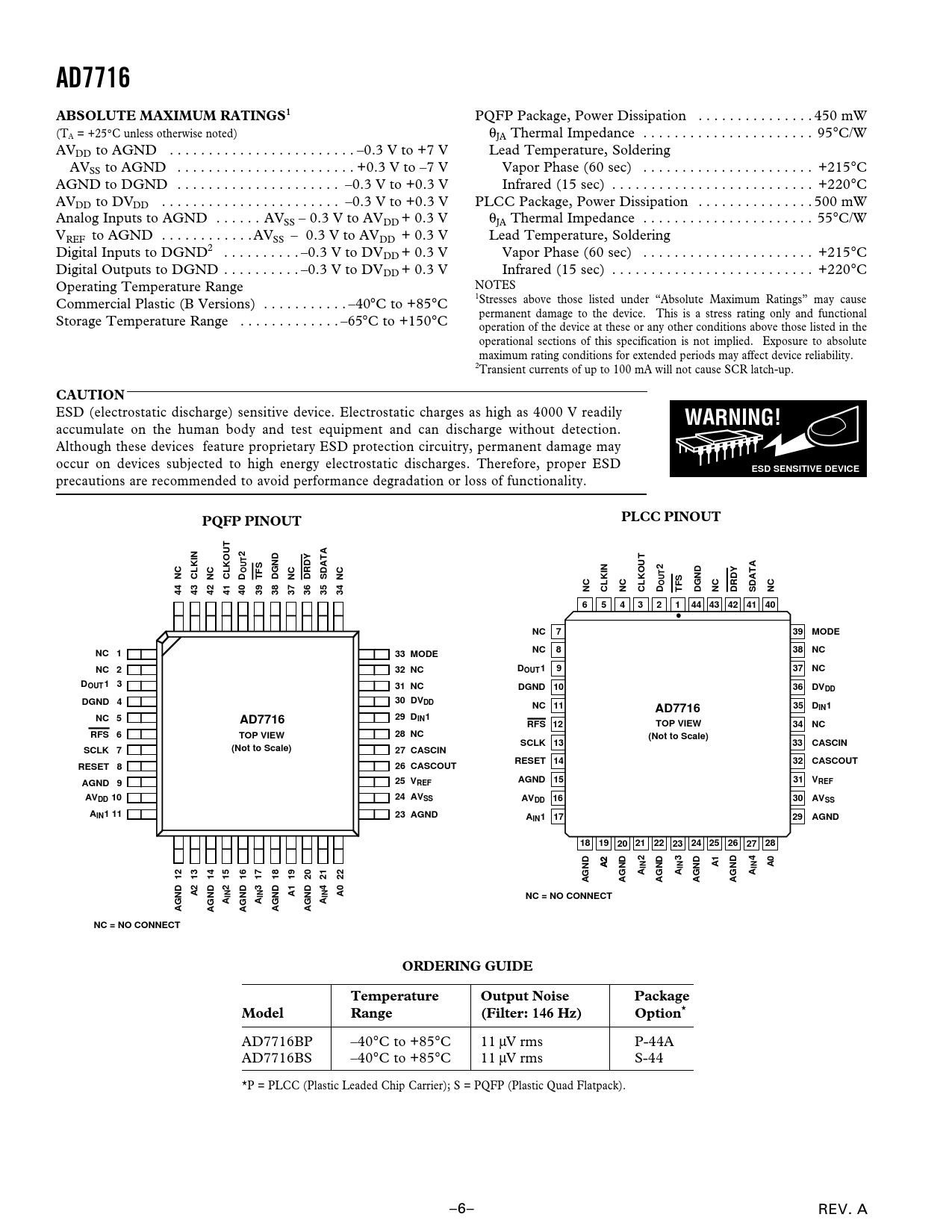 AD7716ABSOLUTE MAXIMUM RATINGS1 PQFP Package, Power Dissipation . 450 mW (T θ A = +25°C unless otherwise noted) JA Thermal Impedance . 95°C/W AVDD to AGND . –0.3 V to +7 V Lead Temperature, Soldering AVSS to AGND . +0.3 V to –7 V Vapor Phase (60 sec) . +215°C AGND to DGND . –0.3 V to +0.3 V Infrared (15 sec) . +220°C AVDD to DVDD . –0.3 V to +0.3 V PLCC Package, Power Dissipation . 500 mW Analog Inputs to AGND . AV θ SS – 0.3 V to AVDD + 0.3 V JA Thermal Impedance . 55°C/W VREF to AGND . AVSS – 0.3 V to AVDD + 0.3 V Lead Temperature, Soldering Digital Inputs to DGND2 . –0.3 V to DVDD + 0.3 V Vapor Phase (60 sec) . +215°C Digital Outputs to DGND . –0.3 V to DVDD + 0.3 V Infrared (15 sec) . +220°C Operating Temperature Range NOTES 1 Commercial Plastic (B Versions) . –40°C to +85°C Stresses above those listed under “Absolute Maximum Ratings” may cause permanent damage to the device. This is a stress rating only and functional Storage Temperature Range . –65°C to +150°C operation of the device at these or any other conditions above those listed in the operational sections of this specification is not implied. Exposure to absolute maximum rating conditions for extended periods may affect device reliability. 2Transient currents of up to 100 mA will not cause SCR latch-up. CAUTION ESD (electrostatic discharge) sensitive device. Electrostatic charges as high as 4000 V readily WARNING! accumulate on the human body and test equipment and can discharge without detection. Although these devices feature proprietary ESD protection circuitry, permanent damage may occur on devices subjected to high energy electrostatic discharges. Therefore, proper ESD ESD SENSITIVE DEVICE precautions are recommended to avoid performance degradation or loss of functionality. PQFP PINOUTPLCC PINOUT22OUTOUTNCCLKINNCCLKOUTDTFSDGNDNCDRDYSDATANC44 NC43 CLKIN42 NC41 CLKOUT40 D39 TFS38 DGND37 NC36 DRDY35 SDATA34 NC65432144 43 42 41 40NC739MODENC838NCNC 133 MODENC 232 NCDOUT1937NCDOUT1 331 NCDGND 1036DVDDDGND 430 DVDDNC 1135 DIN1AD7716NC 529 DIN1AD7716RFS 12TOP VIEW34NCRFS 6TOP VIEW28 NC(Not to Scale)SCLK 1333CASCINSCLK 7(Not to Scale)27 CASCINRESET 1432CASCOUTRESET 826 CASCOUT25 VAGND 1531 VREFAGND 9REFAV24 AVDD 10SSAVDD 1630AVSSAIN1 1123 AGNDAIN1 1729AGND18 19 20 21 22 23 24 25 26 27 28234A2ININA1INA0AAAAGNDAGNDAGNDAGNDAGND2 153 174 21A2 13ININA1 19INA0 22NC = NO CONNECTAAAAGND 14AGND 16AGND 18AGND 20AGND 12NC = NO CONNECTORDERING GUIDETemperatureOutput NoisePackageModelRange(Filter: 146 Hz)Option* AD7716BP –40°C to +85°C 11 µV rms P-44A AD7716BS –40°C to +85°C 11 µV rms S-44 *P = PLCC (Plastic Leaded Chip Carrier); S = PQFP (Plastic Quad Flatpack). –6– REV. A