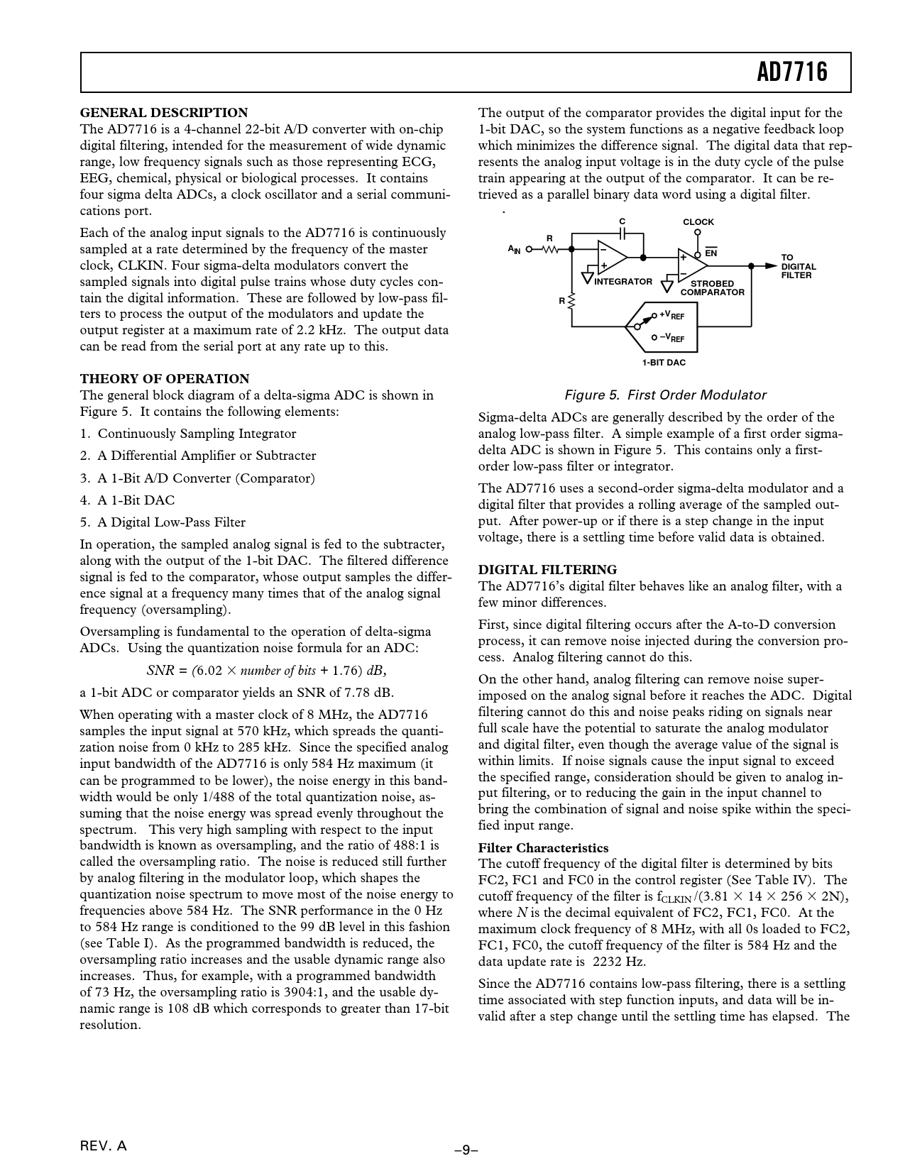 AD7716GENERAL DESCRIPTION The output of the comparator provides the digital input for the The AD7716 is a 4-channel 22-bit A/D converter with on-chip 1-bit DAC, so the system functions as a negative feedback loop digital filtering, intended for the measurement of wide dynamic which minimizes the difference signal. The digital data that rep- range, low frequency signals such as those representing ECG, resents the analog input voltage is in the duty cycle of the pulse EEG, chemical, physical or biological processes. It contains train appearing at the output of the comparator. It can be re- four sigma delta ADCs, a clock oscillator and a serial communi- trieved as a parallel binary data word using a digital filter. cations port. CCLOCK Each of the analog input signals to the AD7716 is continuously R sampled at a rate determined by the frequency of the master AINENTO clock, CLKIN. Four sigma-delta modulators convert the DIGITAL sampled signals into digital pulse trains whose duty cycles con- FILTERINTEGRATORSTROBED tain the digital information. These are followed by low-pass fil- COMPARATORR ters to process the output of the modulators and update the +VREF output register at a maximum rate of 2.2 kHz. The output data –VREF can be read from the serial port at any rate up to this. 1-BIT DACTHEORY OF OPERATION The general block diagram of a delta-sigma ADC is shown in Figure 5. First Order Modulator Figure 5. It contains the following elements: Sigma-delta ADCs are generally described by the order of the 1. Continuously Sampling Integrator analog low-pass filter. A simple example of a first order sigma- 2. A Differential Amplifier or Subtracter delta ADC is shown in Figure 5. This contains only a first- order low-pass filter or integrator. 3. A 1-Bit A/D Converter (Comparator) The AD7716 uses a second-order sigma-delta modulator and a 4. A 1-Bit DAC digital filter that provides a rolling average of the sampled out- 5. A Digital Low-Pass Filter put. After power-up or if there is a step change in the input voltage, there is a settling time before valid data is obtained. In operation, the sampled analog signal is fed to the subtracter, along with the output of the 1-bit DAC. The filtered difference DIGITAL FILTERING signal is fed to the comparator, whose output samples the differ- The AD7716’s digital filter behaves like an analog filter, with a ence signal at a frequency many times that of the analog signal few minor differences. frequency (oversampling). First, since digital filtering occurs after the A-to-D conversion Oversampling is fundamental to the operation of delta-sigma process, it can remove noise injected during the conversion pro- ADCs. Using the quantization noise formula for an ADC: cess. Analog filtering cannot do this. SNR = (6.02 3 number of bits + 1.76) dB, On the other hand, analog filtering can remove noise super- a 1-bit ADC or comparator yields an SNR of 7.78 dB. imposed on the analog signal before it reaches the ADC. Digital When operating with a master clock of 8 MHz, the AD7716 filtering cannot do this and noise peaks riding on signals near samples the input signal at 570 kHz, which spreads the quanti- full scale have the potential to saturate the analog modulator zation noise from 0 kHz to 285 kHz. Since the specified analog and digital filter, even though the average value of the signal is input bandwidth of the AD7716 is only 584 Hz maximum (it within limits. If noise signals cause the input signal to exceed can be programmed to be lower), the noise energy in this band- the specified range, consideration should be given to analog in- width would be only 1/488 of the total quantization noise, as- put filtering, or to reducing the gain in the input channel to suming that the noise energy was spread evenly throughout the bring the combination of signal and noise spike within the speci- spectrum. This very high sampling with respect to the input fied input range. bandwidth is known as oversampling, and the ratio of 488:1 is Filter Characteristics called the oversampling ratio. The noise is reduced still further The cutoff frequency of the digital filter is determined by bits by analog filtering in the modulator loop, which shapes the FC2, FC1 and FC0 in the control register (See Table IV). The quantization noise spectrum to move most of the noise energy to cutoff frequency of the filter is fCLKIN /(3.81 3 14 3 256 3 2N), frequencies above 584 Hz. The SNR performance in the 0 Hz where N is the decimal equivalent of FC2, FC1, FC0. At the to 584 Hz range is conditioned to the 99 dB level in this fashion maximum clock frequency of 8 MHz, with all 0s loaded to FC2, (see Table I). As the programmed bandwidth is reduced, the FC1, FC0, the cutoff frequency of the filter is 584 Hz and the oversampling ratio increases and the usable dynamic range also data update rate is 2232 Hz. increases. Thus, for example, with a programmed bandwidth Since the AD7716 contains low-pass filtering, there is a settling of 73 Hz, the oversampling ratio is 3904:1, and the usable dy- time associated with step function inputs, and data will be in- namic range is 108 dB which corresponds to greater than 17-bit valid after a step change until the settling time has elapsed. The resolution. REV. A –9–