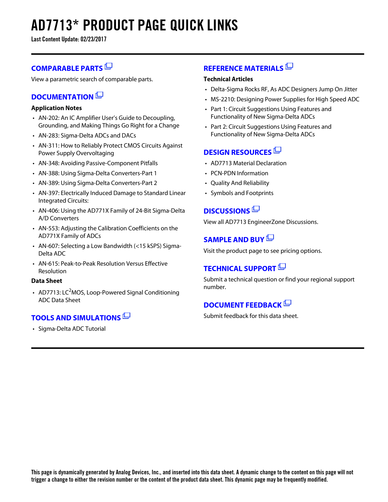 AD7713* PRODUCT PAGE QUICK LINKS Last Content Update: 02/23/2017. COMPARABLE PARTS. REFERENCE MATERIALS. Technical Articles