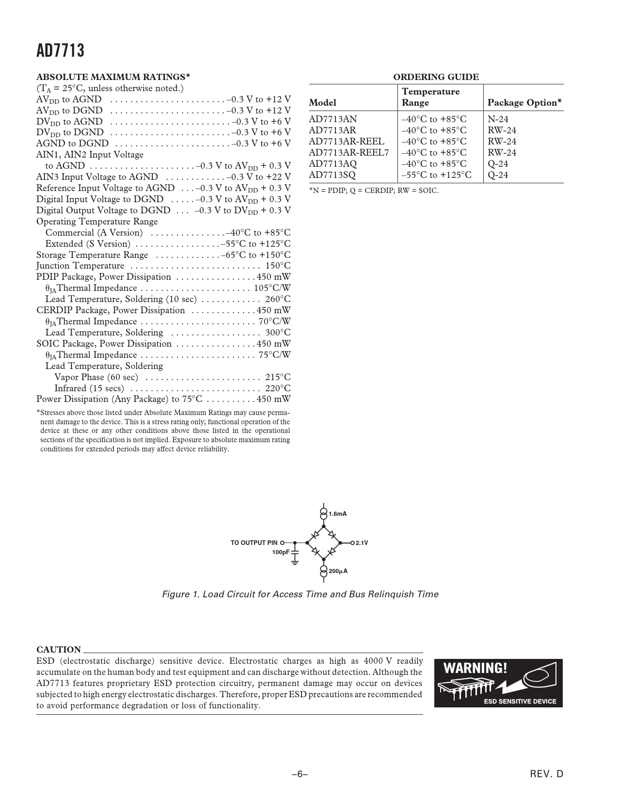 AD7713. ABSOLUTE MAXIMUM RATINGS*. ORDERING GUIDE. Temperature. Model. Range. Package Option*. 1.6mA. TO OUTPUT PIN. 2.1V. 100pF. 200. CAUTION