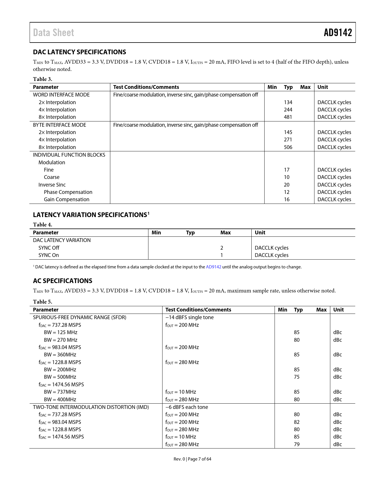 Data Sheet. AD9142. DAC LATENCY SPECIFICATIONS. Table 3. Parameter. Test Conditions/Comments. Min Typ Max Unit