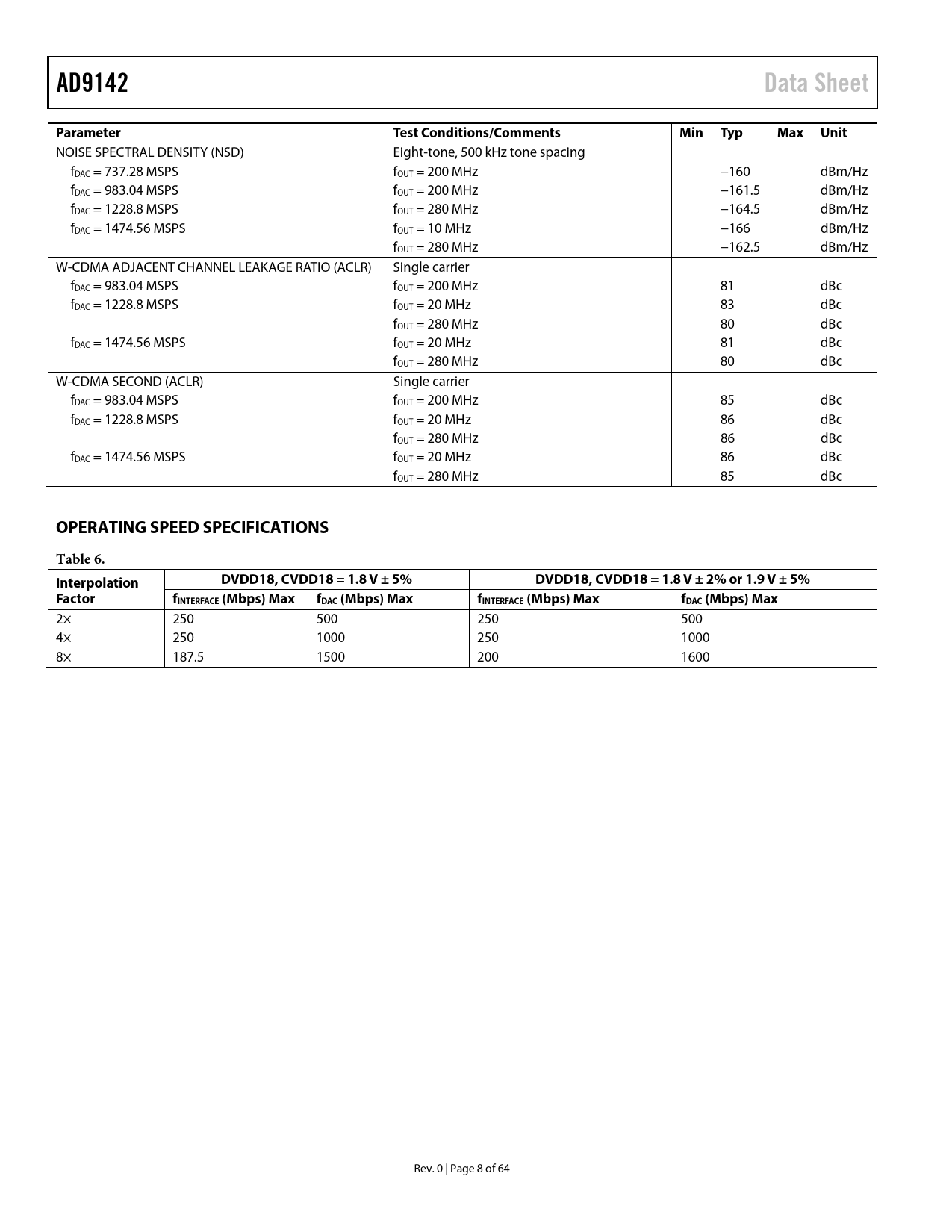 NOISE SPECTRAL DENSITY (NSD) Eight-tone, 500 kHz tone spacing fDAC = 737.28 MSPS fOUT = 200 MHz −160 dBm/Hz fDAC = 983.04 MSPS fOUT = 200 MHz −161.5 dBm/Hz fDAC = 1228.8 MSPS fOUT = 280 MHz −164.5 dBm/Hz fDAC = 1474.56 MSPS fOUT = 10 MHz −166 dBm/Hz fOUT = 280 MHz −162.5 dBm/Hz W-CDMA ADJACENT CHANNEL LEAKAGE RATIO (ACLR) Single carrier fDAC = 983.04 MSPS fOUT = 200 MHz 81 dBc fDAC = 1228.8 MSPS fOUT = 20 MHz 83 dBc fOUT = 280 MHz 80 dBc fDAC = 1474.56 MSPS fOUT = 20 MHz 81 dBc fOUT = 280 MHz 80 dBc W-CDMA SECOND (ACLR) Single carrier fDAC = 983.04 MSPS fOUT = 200 MHz 85 dBc fDAC = 1228.8 MSPS fOUT = 20 MHz 86 dBc fOUT = 280 MHz 86 dBc fDAC = 1474.56 MSPS fOUT = 20 MHz 86 dBc fOUT = 280 MHz 85 dBc