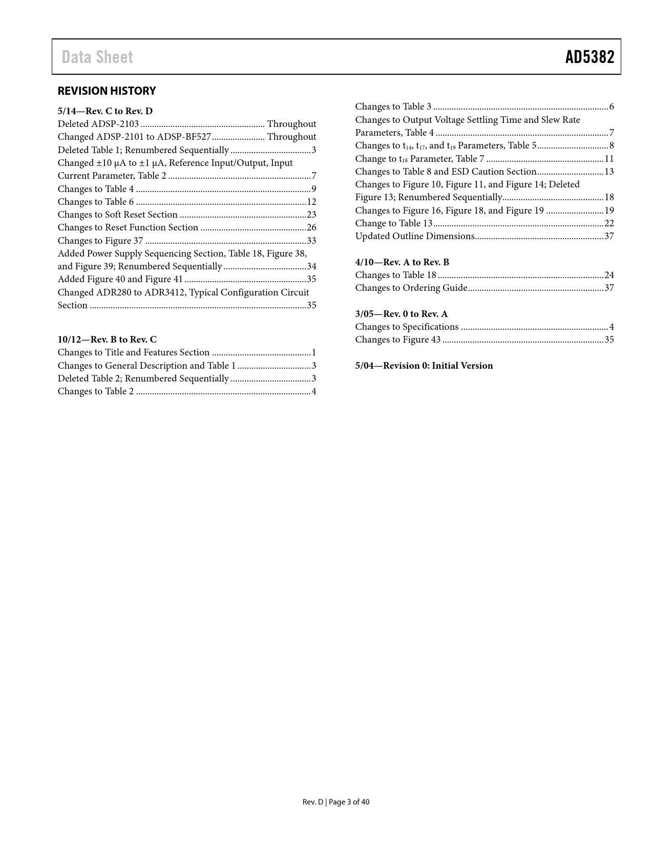 Data SheetAD5382REVISION HISTORY5/14—Rev. C to Rev. D Changes to Table 3 .. 6 Deleted ADSP-2103 .. Throughout Changes to Output Voltage Settling Time and Slew Rate Changed ADSP-2101 to ADSP-BF527 ... Throughout Parameters, Table 4 ... 7 Deleted Table 1; Renumbered Sequentially ... 3 Changes to t14, t17, and t19 Parameters, Table 5 ... 8 Changed ±10 μA to ±1 μA, Reference Input/Output, Input Change to t18 Parameter, Table 7 ... 11 Current Parameter, Table 2 .. 7 Changes to Table 8 and ESD Caution Section ... 13 Changes to Table 4 .. 9 Changes to Figure 10, Figure 11, and Figure 14; Deleted Changes to Table 6 .. 12 Figure 13; Renumbered Sequentially.. 18 Changes to Soft Reset Section ... 23 Changes to Figure 16, Figure 18, and Figure 19 ... 19 Changes to Reset Function Section .. 26 Change to Table 13 .. 22 Changes to Figure 37 .. 33 Updated Outline Dimensions .. 37 Added Power Supply Sequencing Section, Table 18, Figure 38, and Figure 39; Renumbered Sequentially .. 34 4/10—Rev. A to Rev. B Added Figure 40 and Figure 41 ... 35 Changes to Table 18 .. 24 Changed ADR280 to ADR3412, Typical Configuration Circuit Changes to Ordering Guide ... 37 Section .. 35 3/05—Rev. 0 to Rev. A Changes to Specifications .. 4 10/12—Rev. B to Rev. C Changes to Figure 43 .. 35 Changes to Title and Features Section ... 1 Changes to General Description and Table 1 .. 3 5/04—Revision 0: Initial Version Deleted Table 2; Renumbered Sequentially ... 3 Changes to Table 2 .. 4 Rev. D | Page 3 of 40 Document Outline Features Integrated Functions Applications Functional Block Diagram Table of Contents Revision History General Description Specifications AD5382-5 Specifications AD5382-3 Specifications AC Characteristics Timing Characteristics SPI-, QSPI-, MICROWIRE-, or DSP-Compatible Serial Interface I2C Serial Interface Parallel Interface Absolute Maximum Ratings ESD Caution Pin Configuration and Function Descriptions Terminology Typical Performance Characteristics Functional Description DAC Architecture—General Data Decoding On-Chip Special Function Registers (SFR) SFR Commands NOP (No Operation) Write Clear Code Soft Clear Soft Power-Down Soft Power-Up Soft RESET Control Register Write/Read Control Register Contents Channel Monitor Function Hardware Functions Reset Function Asynchronous Clear Function BUSY\ and LDAC\ Functions FIFO Operation in Parallel Mode Power-On Reset Power-Down AD5382 Interfaces DSP-, SPI-, MICROWIRE-Compatible Serial Interfaces Standalone Mode Daisy-Chain Mode Readback Mode I2C Serial Interface I2C Data Transfer Start and Stop Conditions Repeated Start Conditions Acknowledge Bit (ACK) AD5382 Slave Addresses Write Operation 4-Byte Mode 3-Byte Mode 2-Byte Mode Parallel Interface CS\ Pin WR\ Pin REG0, REG1 Pins Pins A4 to A0 Pins DB13 to DB0 Microprocessor Interfacing Parallel Interface AD5382 to MC68HC11 AD5382 to PIC16C6x/7x AD5382 to 8051 AD5382 to ADSP-BF527 Applications Information Power Supply Decoupling Power Supply Sequencing Typical Configuration Circuit Monitor Function Toggle Mode Function Thermal Monitor Function AD5382 in a MEMS-Based Optical Switch Optical Attenuators Outline Dimensions Ordering Guide