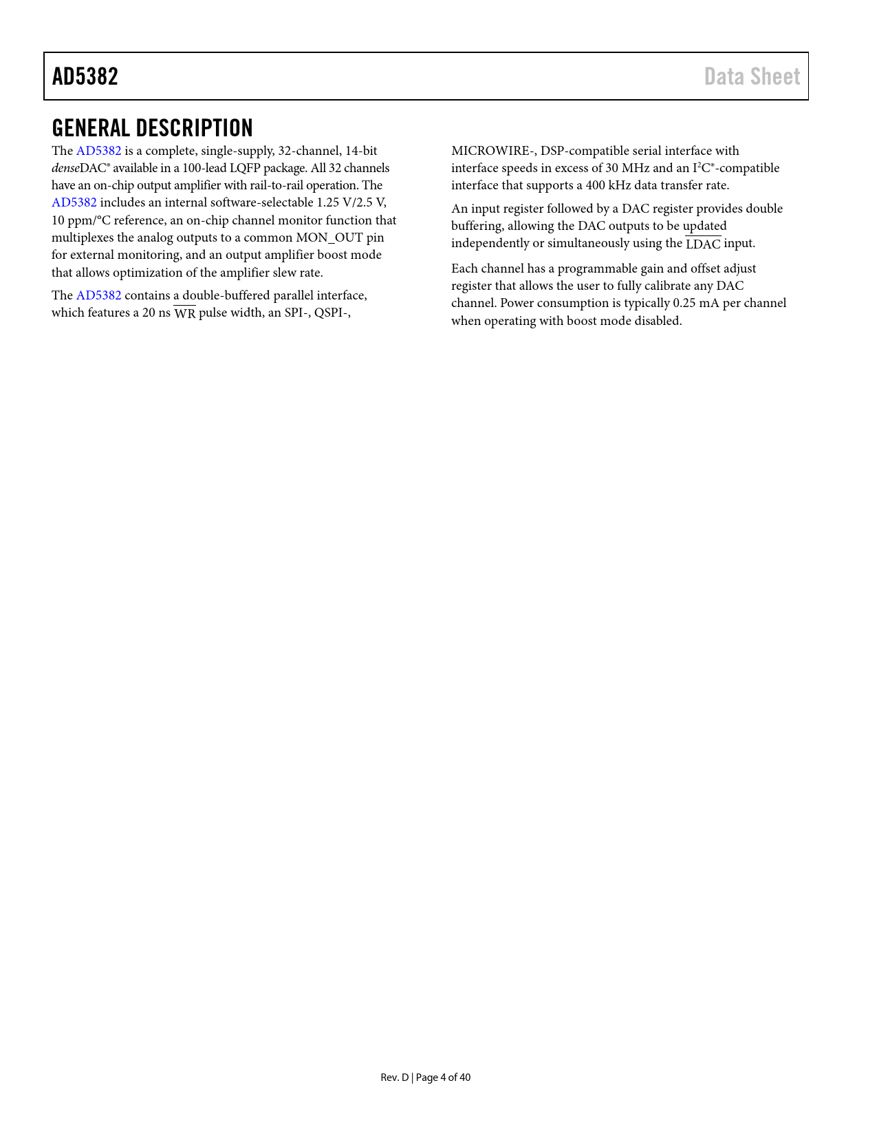 AD5382Data SheetGENERAL DESCRIPTION The AD5382 is a complete, single-supply, 32-channel, 14-bit MICROWIRE-, DSP-compatible serial interface with denseDAC® available in a 100-lead LQFP package. All 32 channels interface speeds in excess of 30 MHz and an I2C®-compatible have an on-chip output amplifier with rail-to-rail operation. The interface that supports a 400 kHz data transfer rate. AD5382 includes an internal software-selectable 1.25 V/2.5 V, An input register followed by a DAC register provides double 10 ppm/°C reference, an on-chip channel monitor function that buffering, al owing the DAC outputs to be updated multiplexes the analog outputs to a common MON_OUT pin independently or simultaneously using the LDAC input. for external monitoring, and an output amplifier boost mode that al ows optimization of the amplifier slew rate. Each channel has a programmable gain and offset adjust register that allows the user to fully calibrate any DAC The AD5382 contains a double-buffered paral el interface, channel. Power consumption is typically 0.25 mA per channel which features a 20 ns WR pulse width, an SPI-, QSPI-, when operating with boost mode disabled. Rev. D | Page 4 of 40 Document Outline Features Integrated Functions Applications Functional Block Diagram Table of Contents Revision History General Description Specifications AD5382-5 Specifications AD5382-3 Specifications AC Characteristics Timing Characteristics SPI-, QSPI-, MICROWIRE-, or DSP-Compatible Serial Interface I2C Serial Interface Parallel Interface Absolute Maximum Ratings ESD Caution Pin Configuration and Function Descriptions Terminology Typical Performance Characteristics Functional Description DAC Architecture—General Data Decoding On-Chip Special Function Registers (SFR) SFR Commands NOP (No Operation) Write Clear Code Soft Clear Soft Power-Down Soft Power-Up Soft RESET Control Register Write/Read Control Register Contents Channel Monitor Function Hardware Functions Reset Function Asynchronous Clear Function BUSY\ and LDAC\ Functions FIFO Operation in Parallel Mode Power-On Reset Power-Down AD5382 Interfaces DSP-, SPI-, MICROWIRE-Compatible Serial Interfaces Standalone Mode Daisy-Chain Mode Readback Mode I2C Serial Interface I2C Data Transfer Start and Stop Conditions Repeated Start Conditions Acknowledge Bit (ACK) AD5382 Slave Addresses Write Operation 4-Byte Mode 3-Byte Mode 2-Byte Mode Parallel Interface CS\ Pin WR\ Pin REG0, REG1 Pins Pins A4 to A0 Pins DB13 to DB0 Microprocessor Interfacing Parallel Interface AD5382 to MC68HC11 AD5382 to PIC16C6x/7x AD5382 to 8051 AD5382 to ADSP-BF527 Applications Information Power Supply Decoupling Power Supply Sequencing Typical Configuration Circuit Monitor Function Toggle Mode Function Thermal Monitor Function AD5382 in a MEMS-Based Optical Switch Optical Attenuators Outline Dimensions Ordering Guide